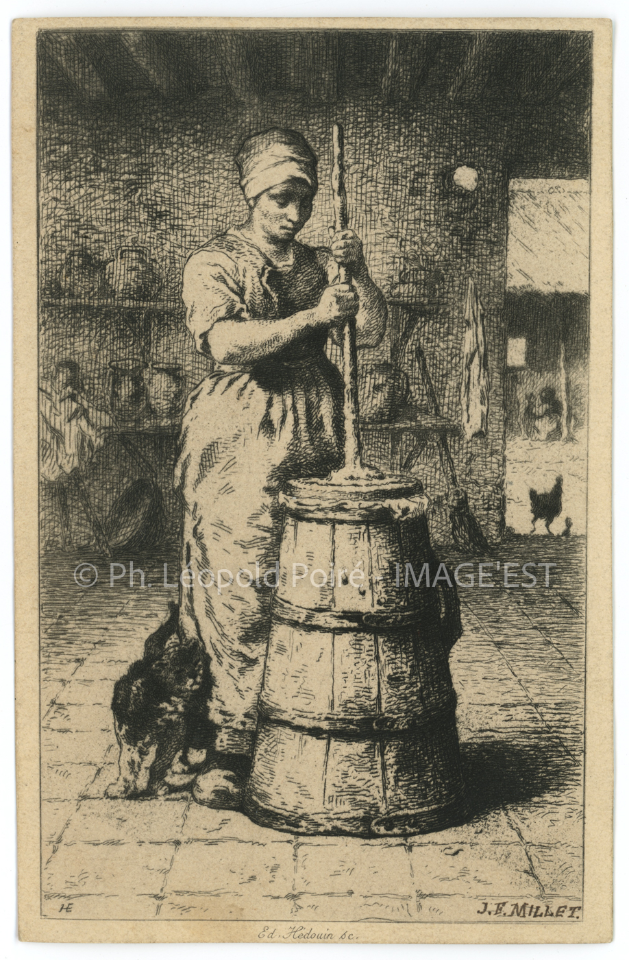 Carte postale d'après une gravure de Jean-François Millet (1814-1875) représentant une femme battant le beurre dans une baratte.