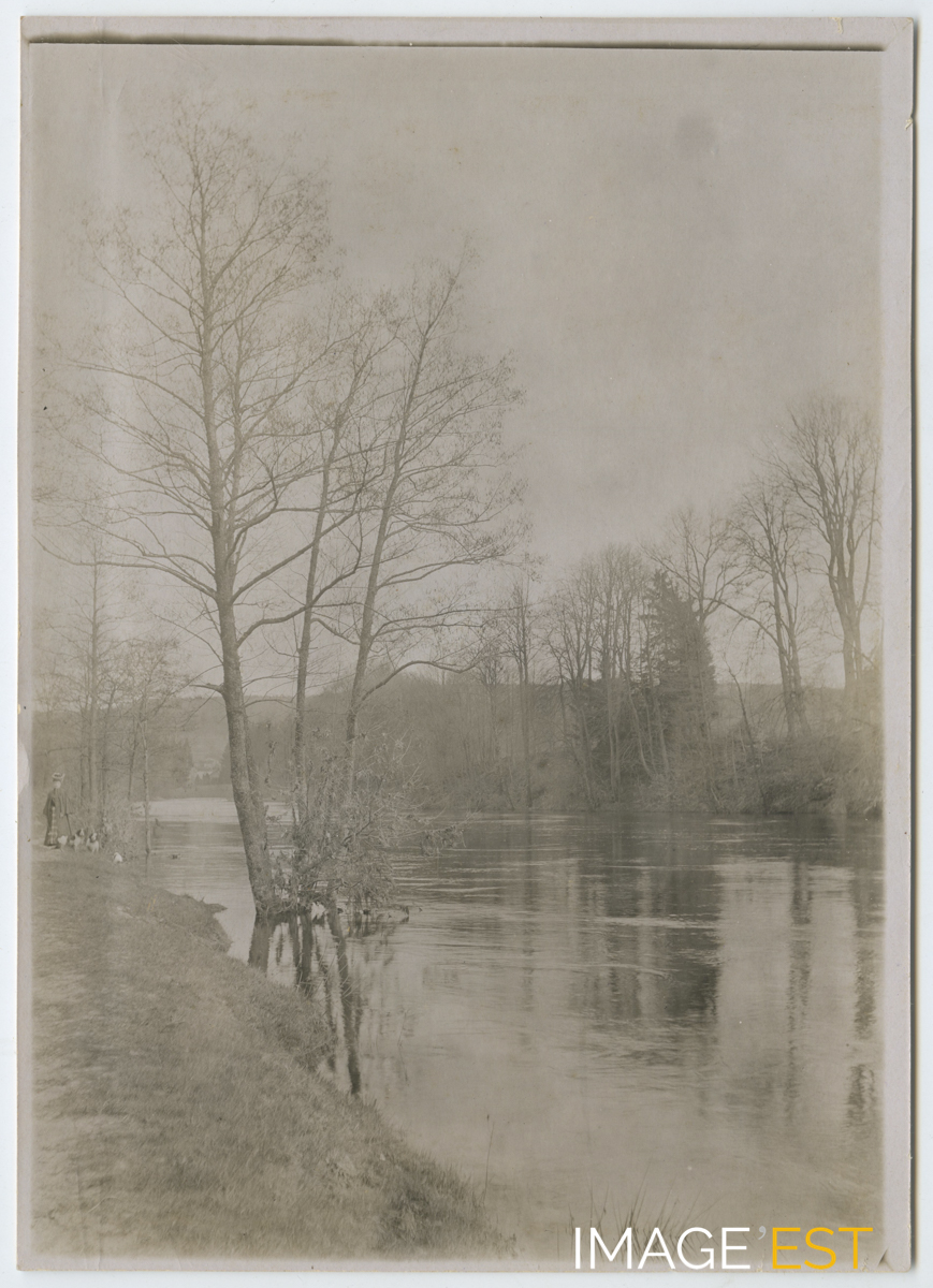 Femmes et chien se promenant sur les berges d'un cours d'eau probablement dans le département des Vosges. Cette photographie est extraite d'un album en cuir repoussé comprenant un ensemble de 48 photographies (format 13 x 18 cm), noir et blanc, illustrant les loisirs et la vie d'une famille aisée probablement dans le département des Vosges à la fin du XIXe ou au début du XXe siècle.