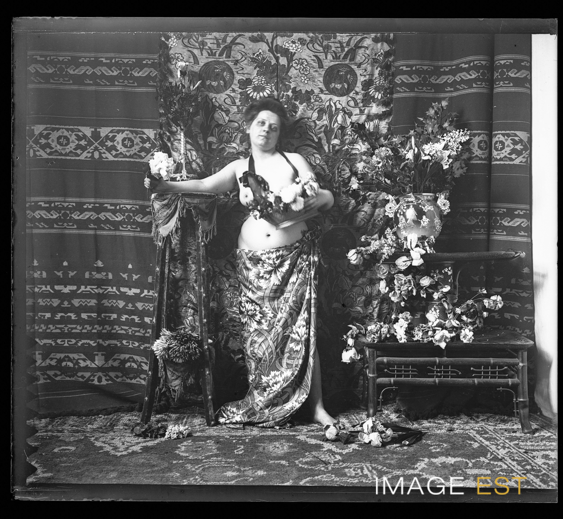 Femme nue en pied tenant une corbeille de fleurs, probablement à Nancy (Meurthe-et-Moselle) dans un décor orientaliste.