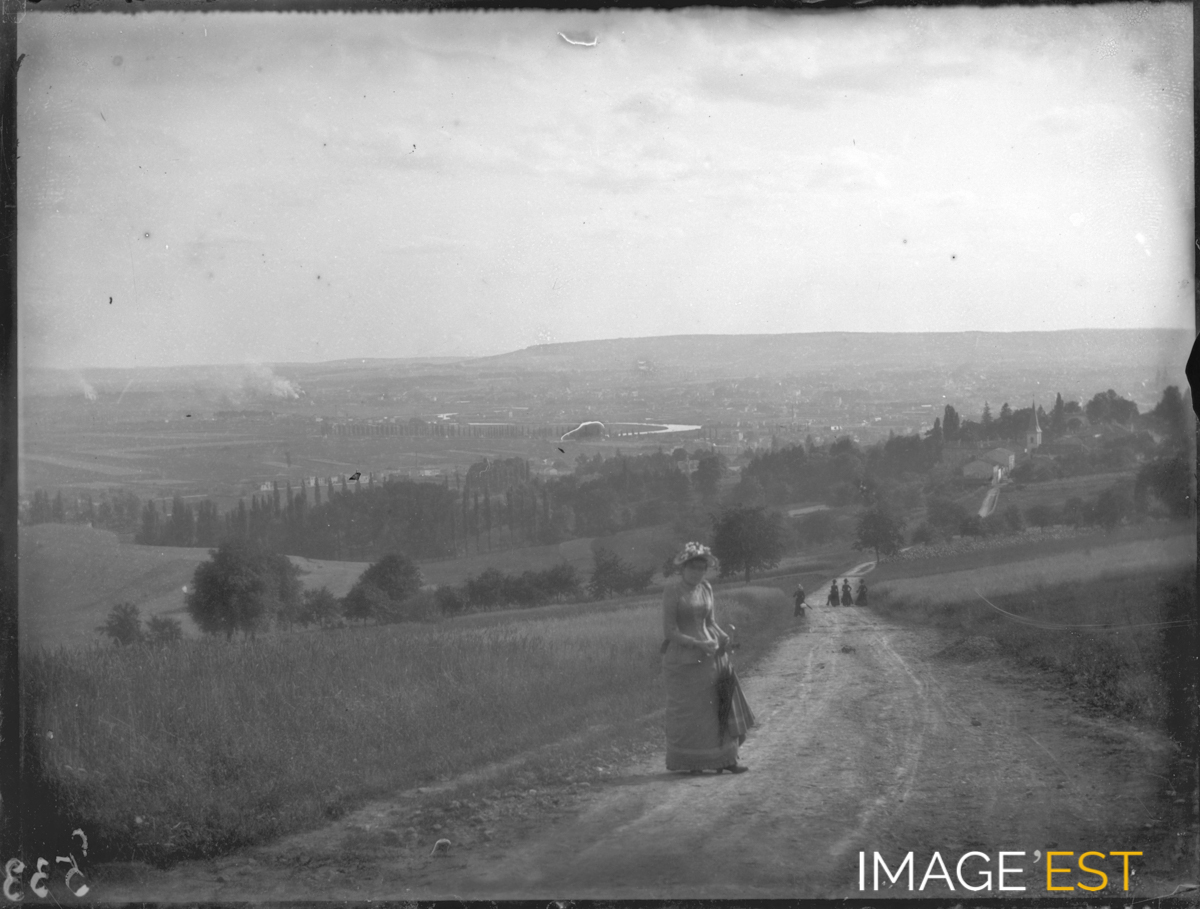Femme sur une allée dans la campagne lorraine probablement proche de Nancy (Meurthe-et-Moselle). À remarquer le groupe de femmes au bout du chemin et une église parmi plusieurs maisons sur les hauteurs. À l'arrière-plan, les méandres d'un cours d'eau et des fumées de cheminées d'usines.