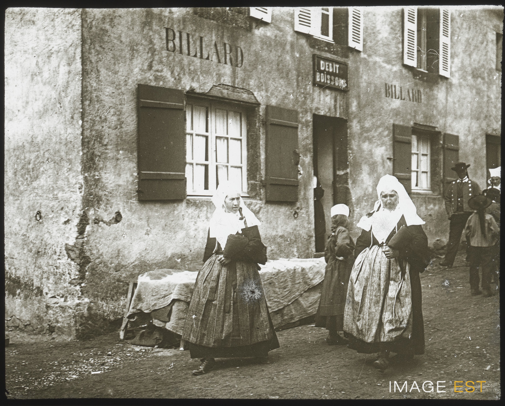 Femmes et hommes en costumes traditionnels dans une rue de Plougastel-Daoulas (Finistère). Une mention manuscrite en marge de la plaque de verre indique : " Plougastel-Daoulis. Costumes du dimanche. "
