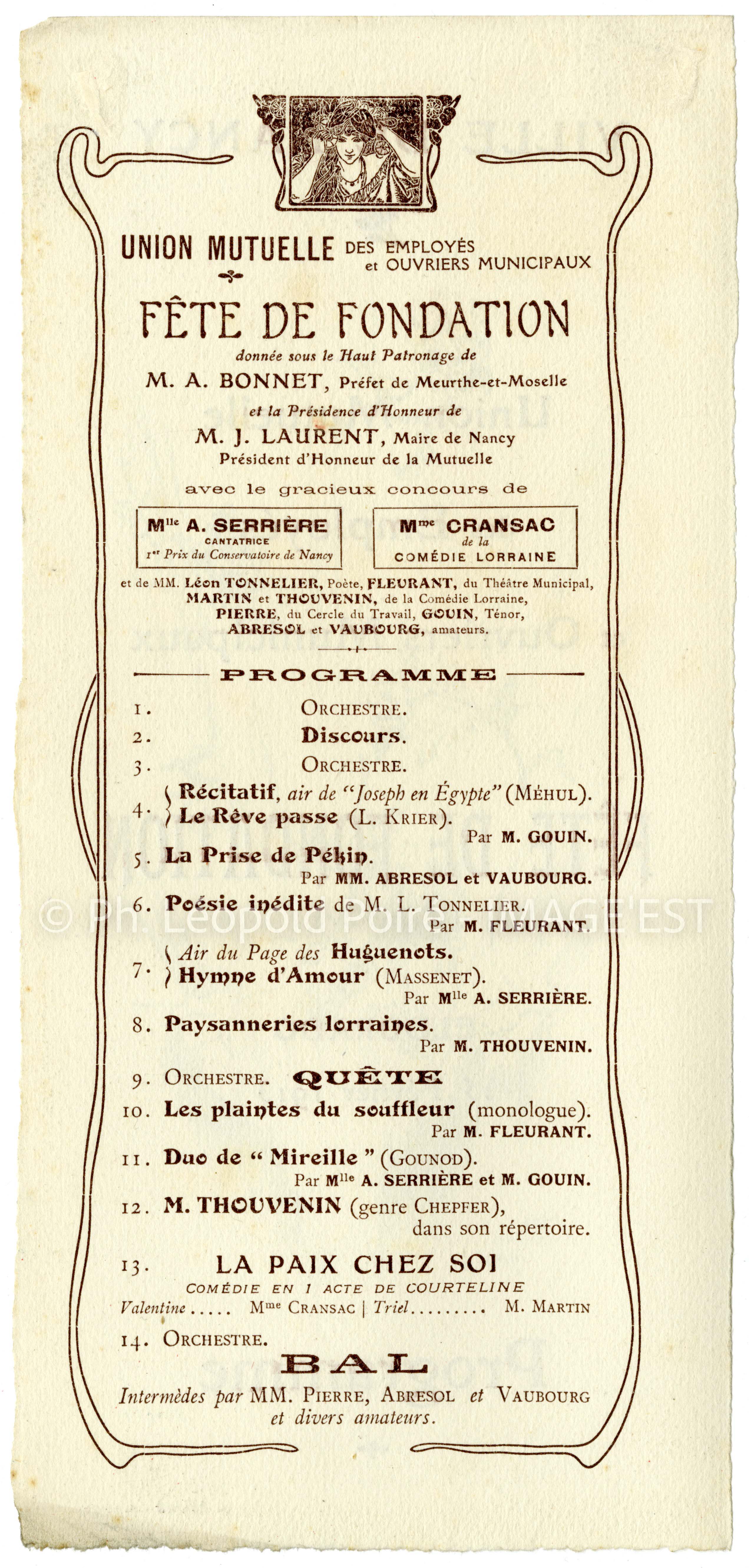 Programme d'une Fête de Fondation donnée par l'Union mutuelle des employés et ouvriers municipaux à Nancy (Meurthe-et-Moselle), illustré par Victor Prouvé (1858-1943). La manifestation a lieu à l'Eldorado le 15 février 1913.
