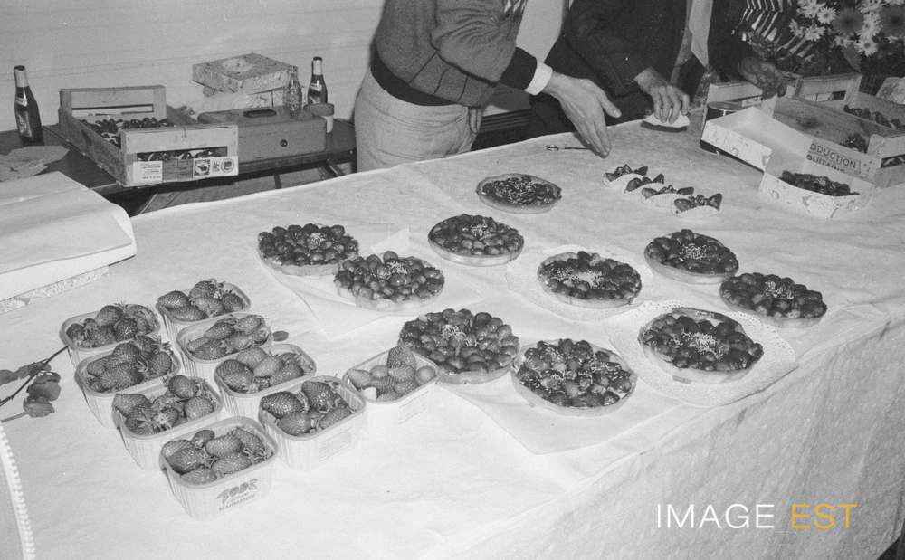 Stand de vente de fraises et de tartes aux fraises lors de la Fête des fraises en 1984 à Maxéville (Meurthe-et-Moselle).