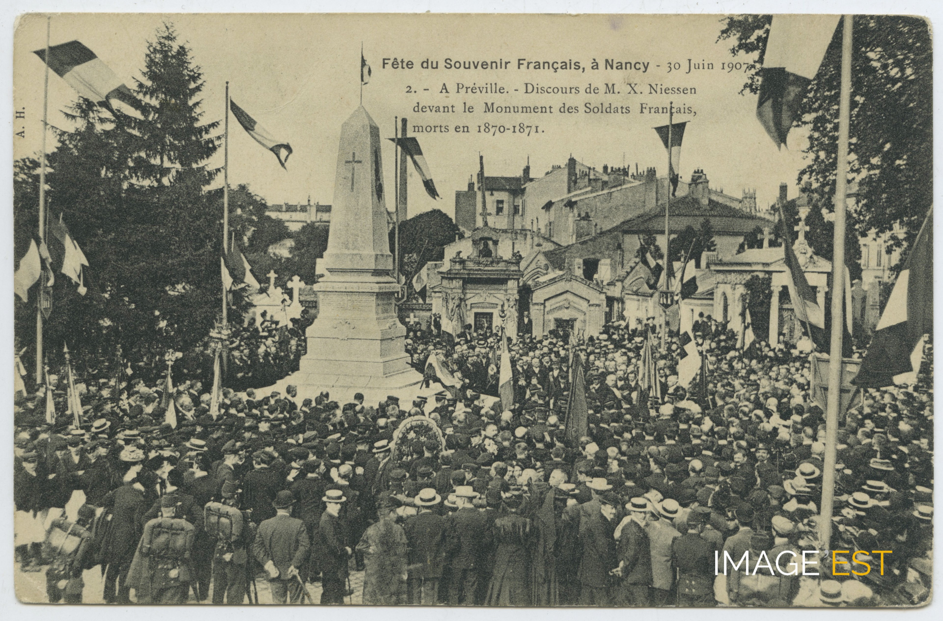Fête du Souvenir Français au cimetière de Préville à Nancy (Meurthe-et-Moselle) le 30 juin 1907 à l'occasion de laquelle M. Niessen prononça un discours devant le monument des soldats français morts durant la Guerre franco-allemande (1870-1871).