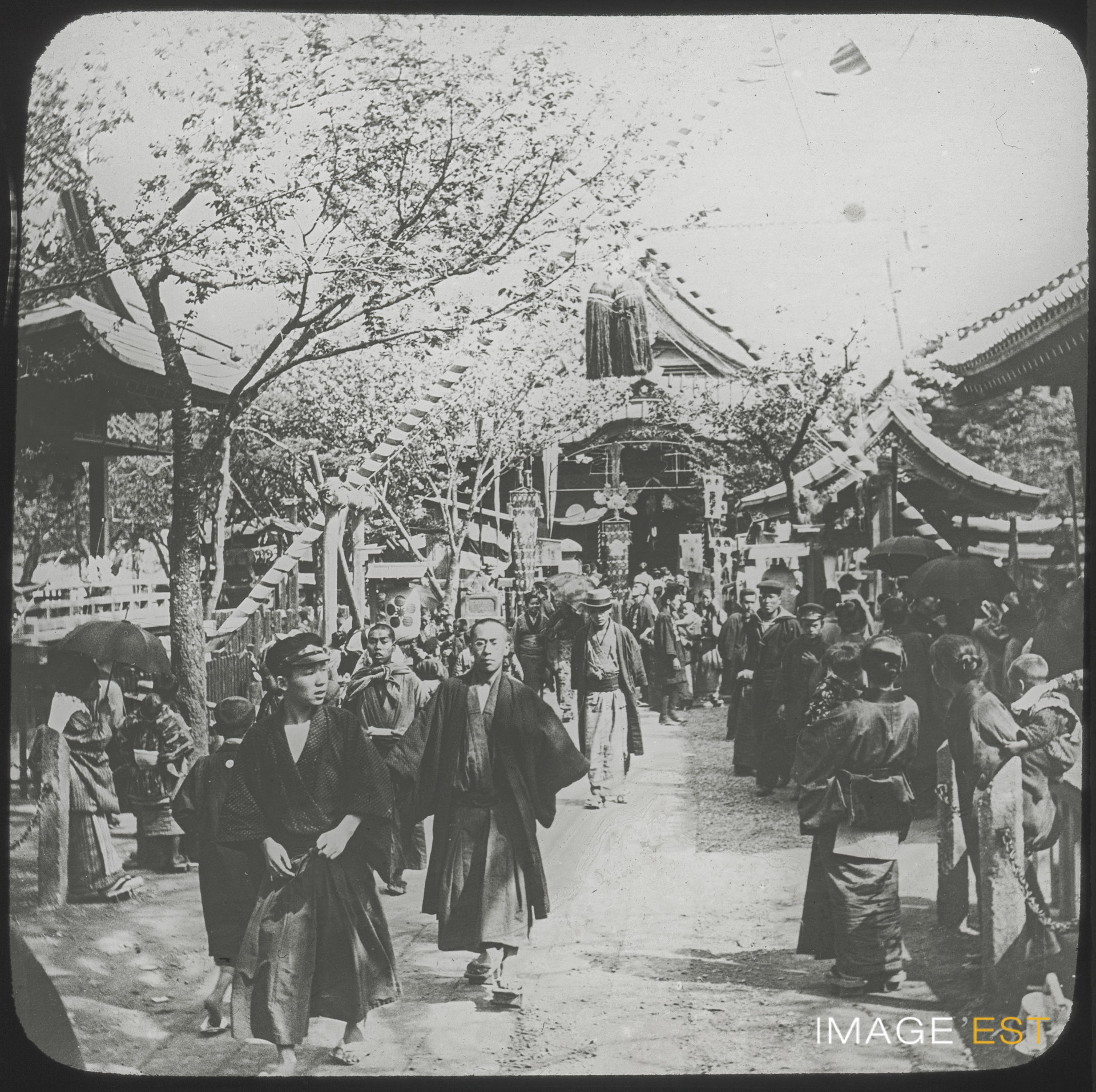 Fête populaire à Tokyo (Japon). Une mention manuscrite en marge de la plaque de verre indique : " Une grande fête à Tokio. "
