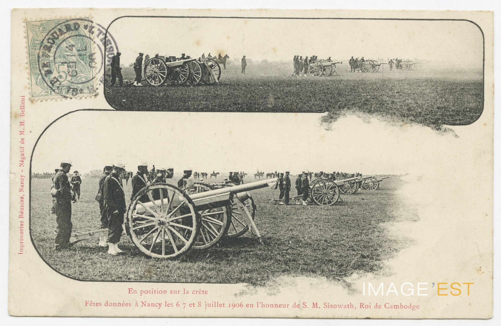 Tirs d'artillerie lors de la revue militaire au plateau de Malzéville (Meurthe-et-Moselle) à l'occasion des fêtes données en l'honneur du roi du Cambodge, Sisowath (1840-1927) les 6, 7, et 8 juillet 1906.