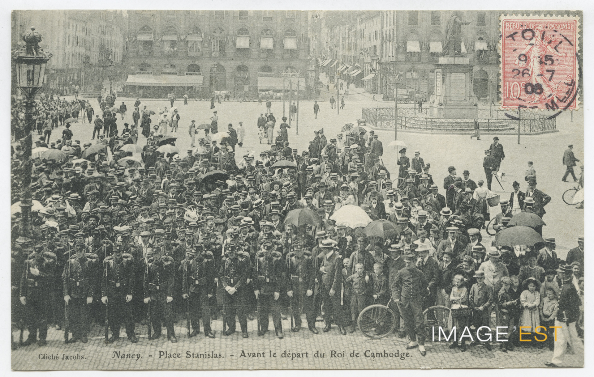 La foule place Stanislas à Nancy (Meurthe-et-Moselle) avant le départ du roi du Cambodge, Sisowath (1840-1927) le 8 juillet 1906.