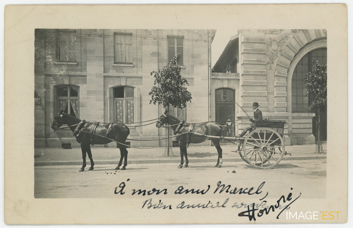 Fiacre attelé devant le gymnase municipal, boulevard Charles V à Nancy (Meurthe-et-Moselle). Une correspondance au verso est adressée à " Monsieur Marcel Henry - Gentlemen-Rider - Joli-C½ur street Nancy ".