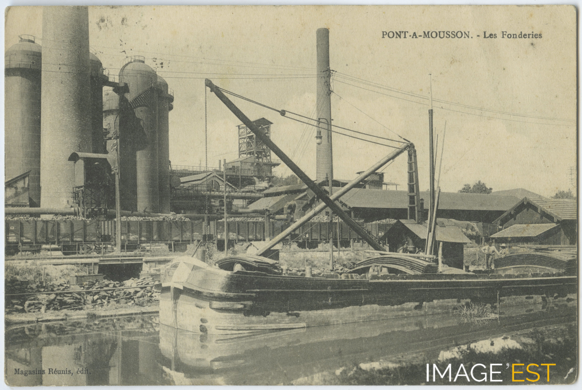 Chargement d'une péniche sur le canal devant les fonderies de Pont-à-Mousson (Meurthe et Moselle).