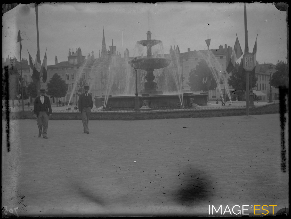 Fontaine de la place Carnot à Nancy (Meurthe-et-Moselle) pavoisée de drapeaux.