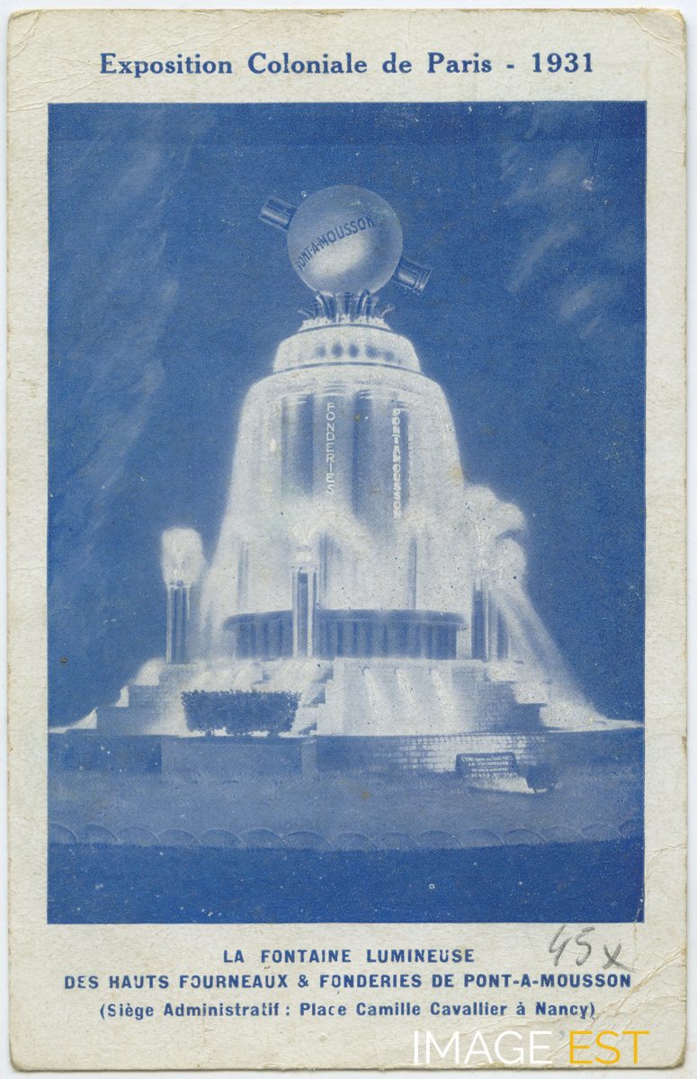 Fontaine lumineuse de la " Société des hauts fourneaux & fonderies de Pont-à-Mousson " présentée à l'Exposition coloniale de Paris en 1931. À noter l'adresse du siège administratif : place Camille Cavallier à Nancy.