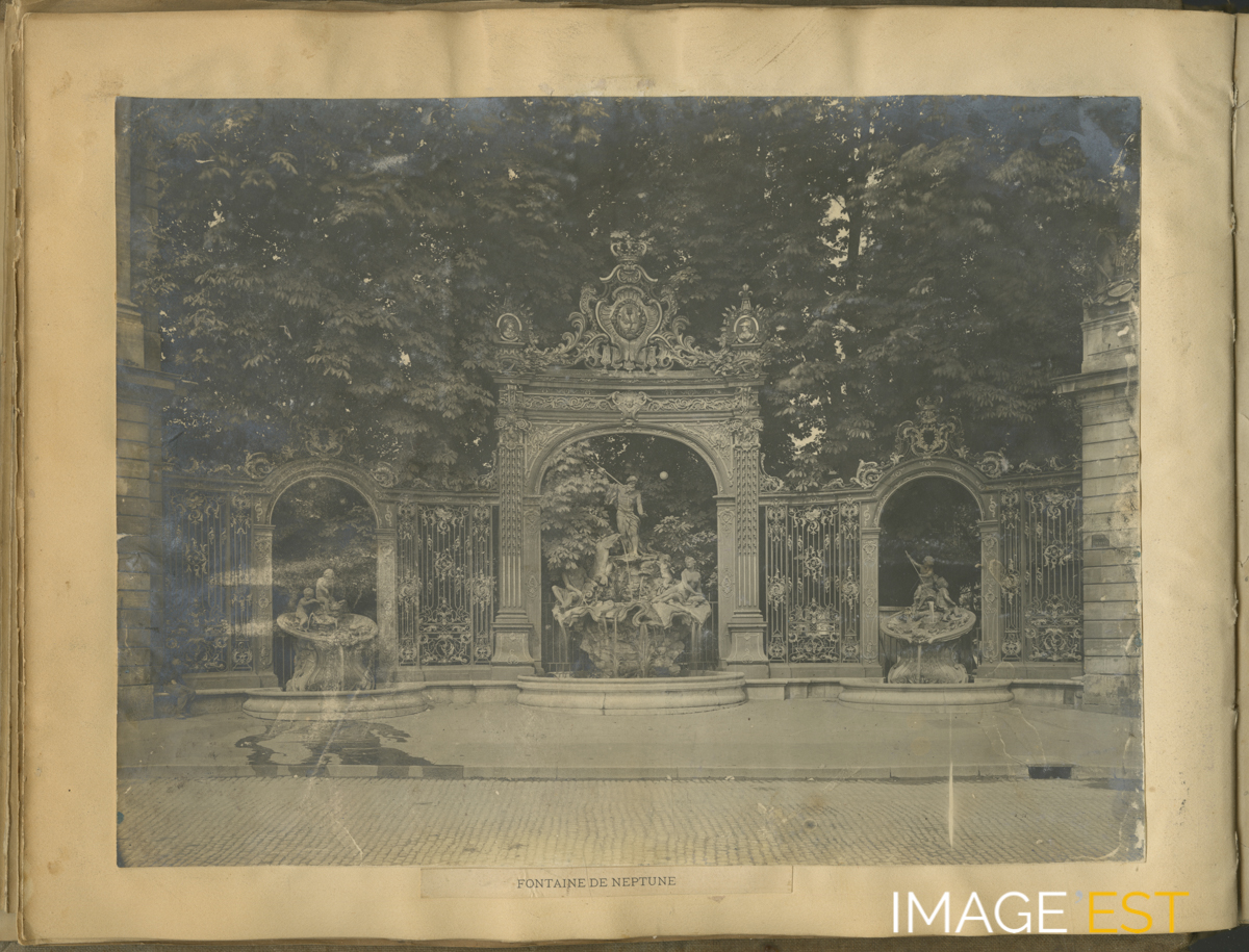 Fontaine Neptune place Stanislas à Nancy (Meurthe-et-Moselle) entre 1870 et 1875. Cette photographie, contrecollée sur une feuille cartonnée, est extraite d'un album de vues sur Nancy, contemporaines de l'achèvement de la construction de la basilique Saint-Epvre entre 1870 et 1875. Un écriteau à l'angle du mur du bâtiment de droite porte l'inscription : " La Centrale ".
