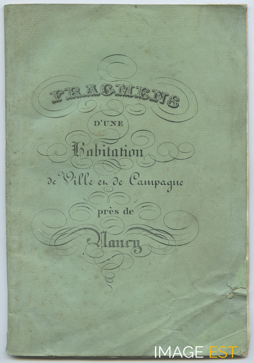 Couverture d'une brochure intitulée " Fragments d'une habitation de la ville et de campagne près de Nancy " à Nancy (Meurthe-et-Moselle). Cette brochure comprend un avis de location d'une " jolie Maison de campagne de Sainte-Marie, à une demi-lieue de Nancy ".