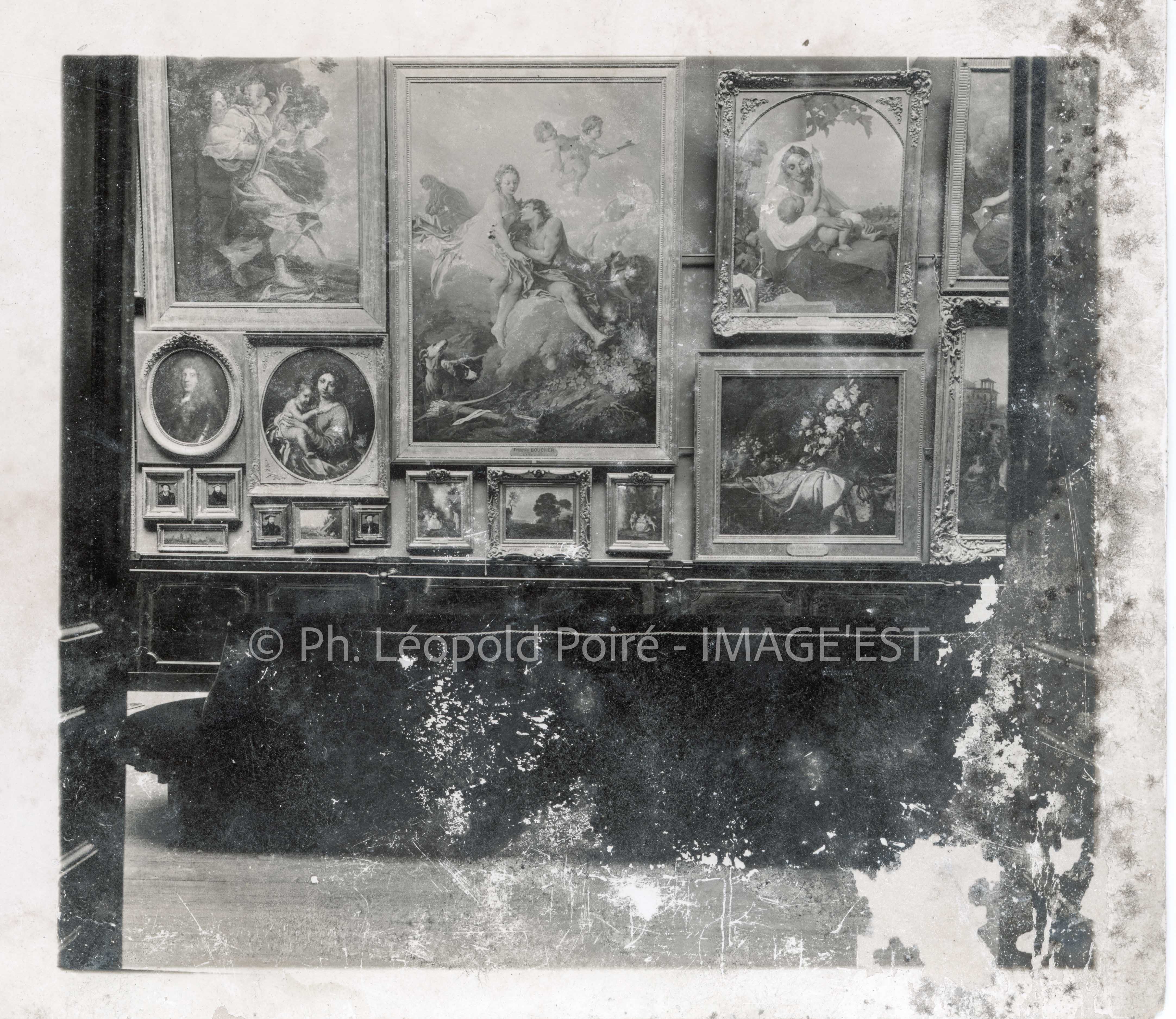 Galerie d'art, probablement au Musée des beaux-arts de Nancy (Meurte-et-Moselle). La plus grande toile eu centre, " Aurore et Céphale " de François Boucher (1703-1770).