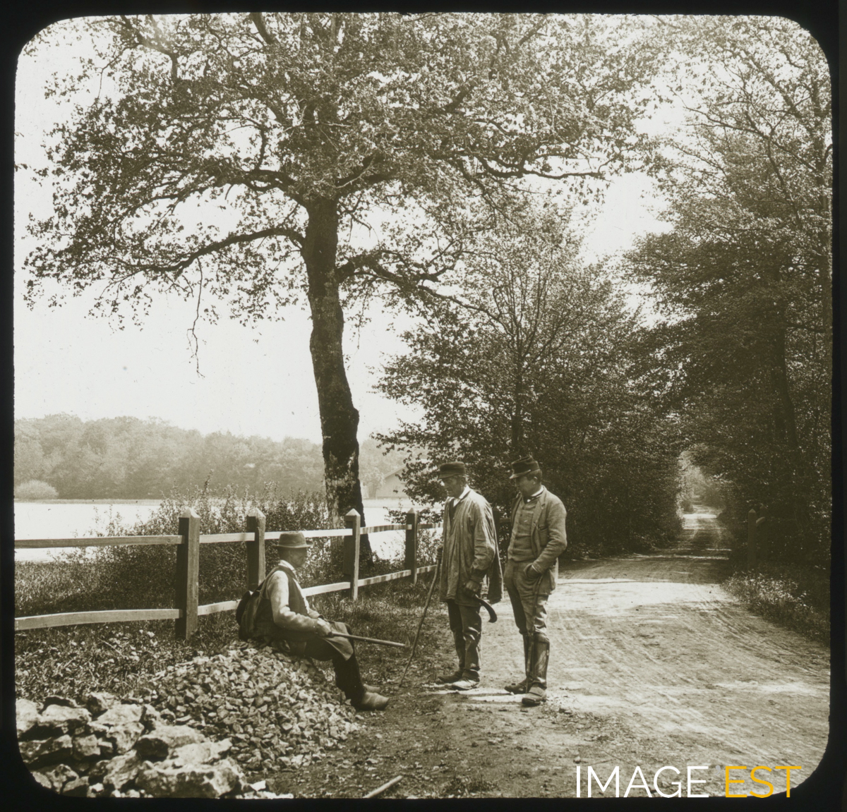 Gardes forestestiers à Brin-sur-Seille (Meurthe-et-Moselle). En marge de la plaque de verre figure la mention : " Collection R. des Robert ". R. des Robert a été membre de la Société lorraine de photographie (1894-1914) dès 1894. Une mention manuscrite en marge de la plaque de verre indique : " Etang de Brin 39 ".
