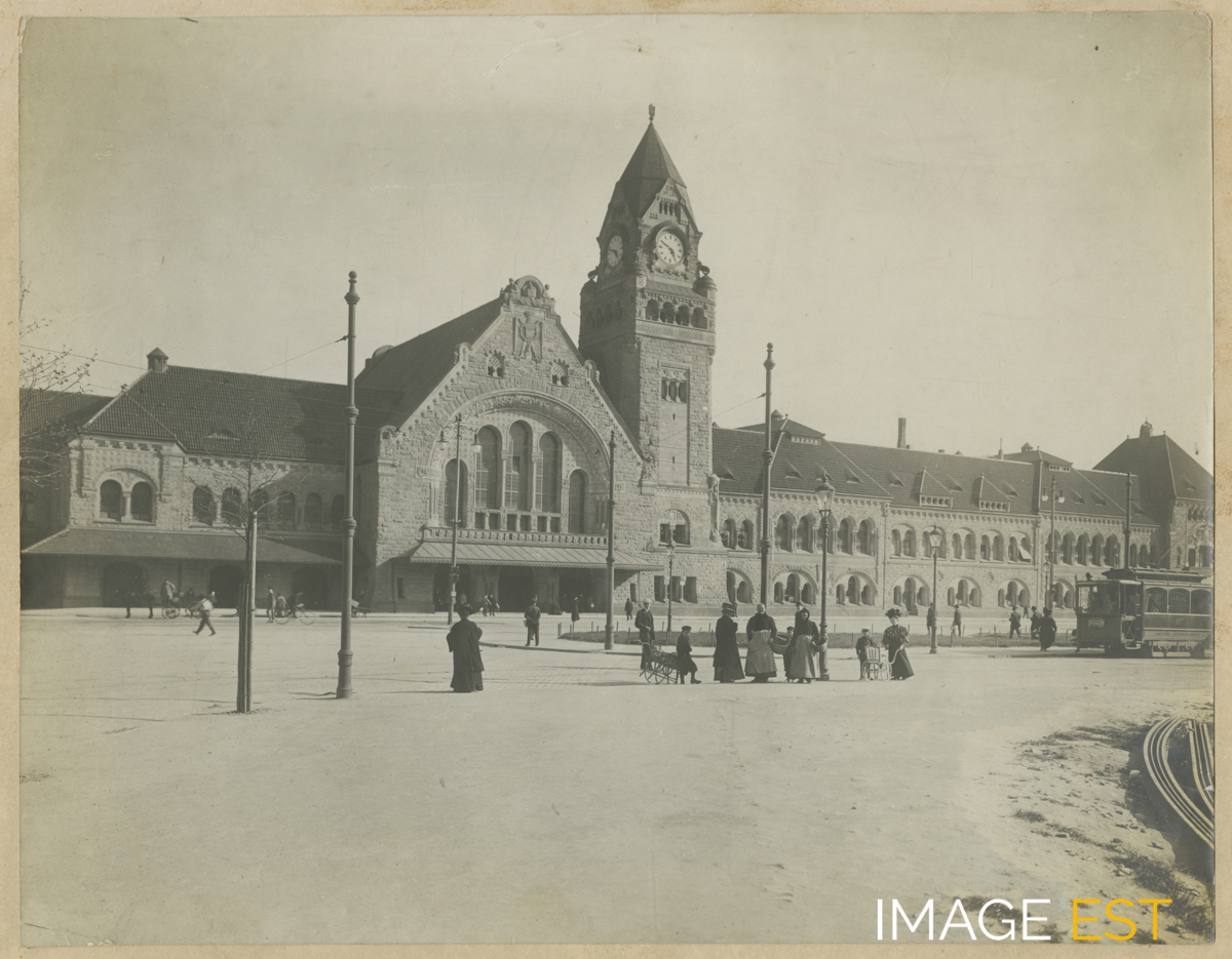Gare ferroviaire à Metz (Moselle). Une mention manuscrite en marge du document indique : " Gare de Metz (vers 1900) ".