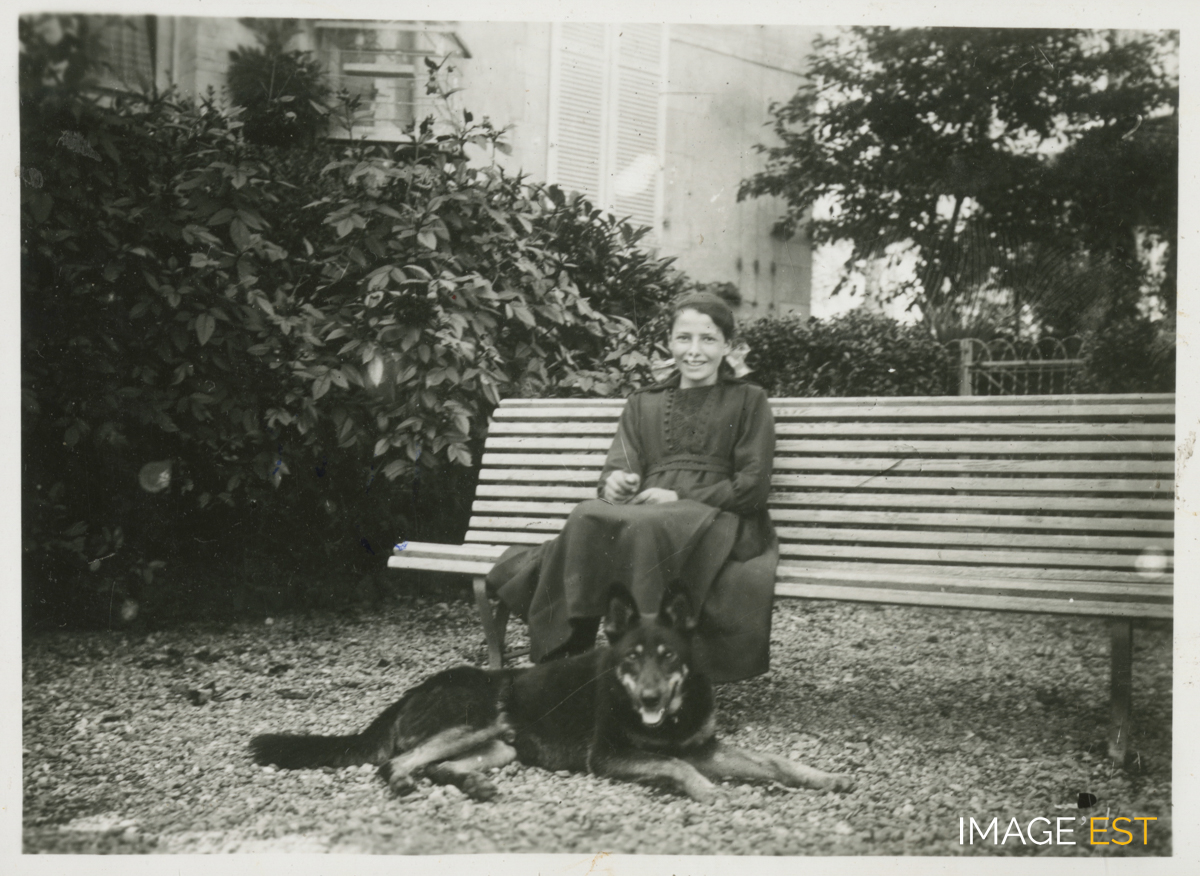Geneviève Kalis (1904-1980), fille de Charles et Berthe Kalis, épouse Jean Moreau en 1925, dans le jardin de la demeure familiale au 5, avenue Georges Clemenceau à Nancy (Meurthe-et-Moselle), construite en 1911 par Fernand César (1879-1969) architecte DPLG de l'École de Nancy. (Source : Archives privées des familles Kalis-Moreau).
