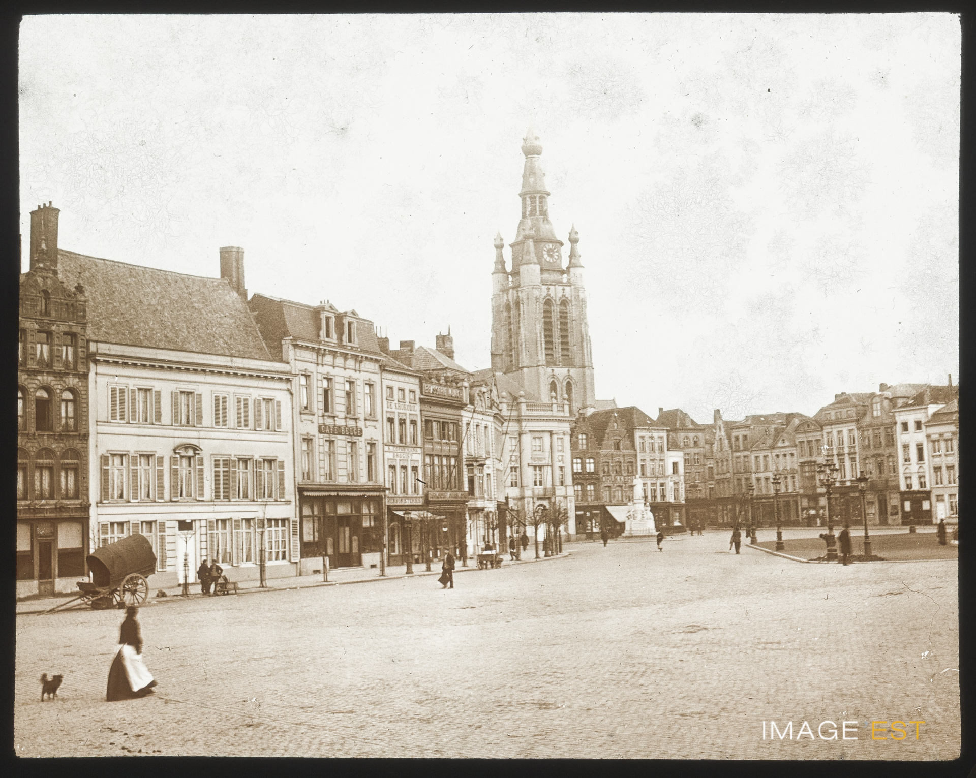 Grand-Place à Courtrai. Une mention manuscrite en marge de la plaque de verre indique : " Courtrai. La Grand'Place. "