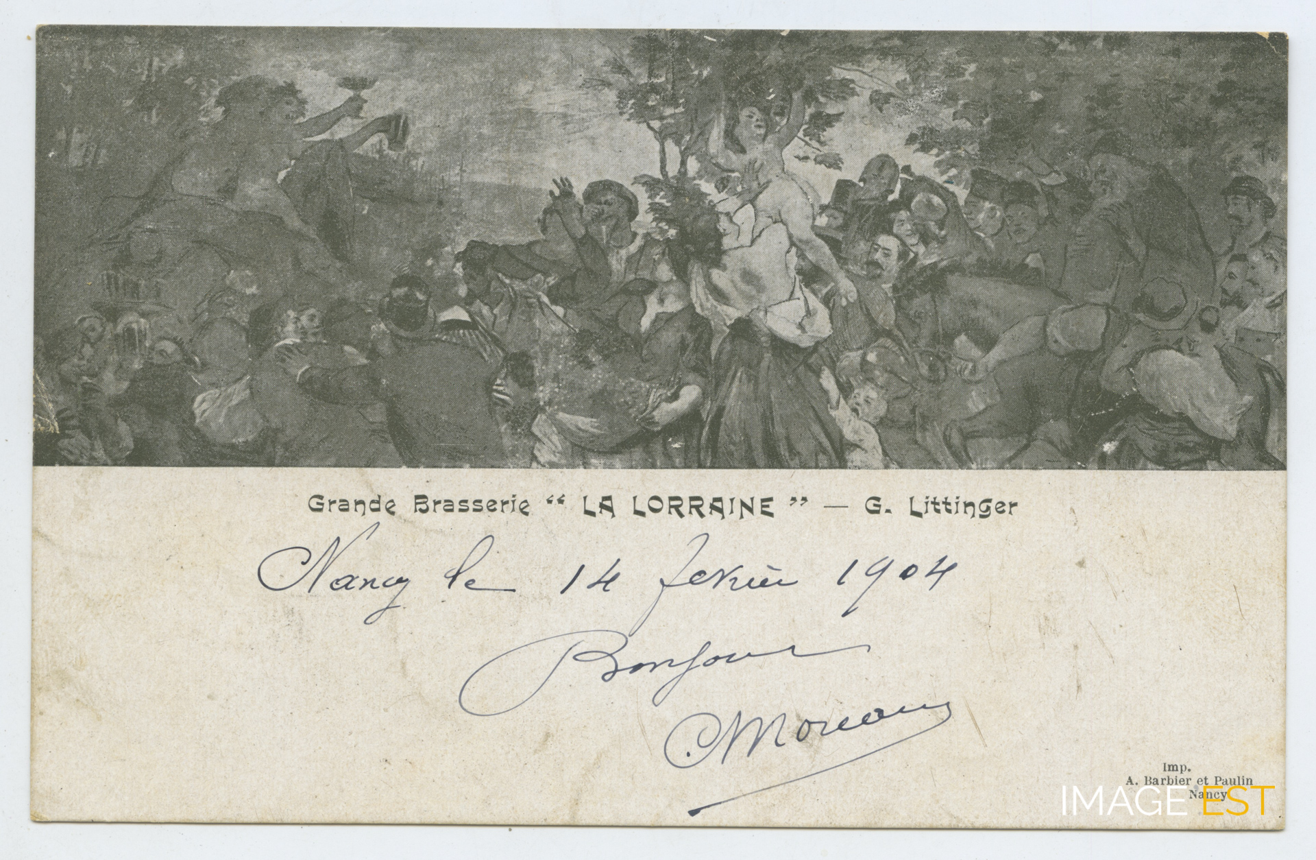 Tableau ornant la salle de la rue Saint-Jean de La Grande Brasserie La Lorraine à Nancy (Meurthe-et-Moselle) réalisé par Victor Prouvé pour l'inauguration de l'établissement en 1887. Il existe deux cartes postales de ce tableau, l'une en noir et blanc, éditée avant 1904 et l'autre en couleurs, publiée après 1904.