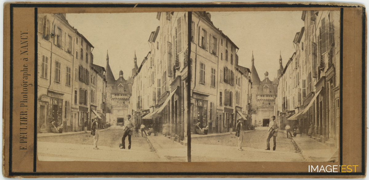 Grande rue et Porte de la Craffe à Nancy (Meurthe-et-Moselle). Cette vue stéréoscopique, contrecollée sur carton, a été réalisée par le photographe nancéien, Édouard Peultier (1826-1870?), originaire de Charmes, actif de 1859 à 1867 et installé 6, rue des Dominicains vers 1857-1858 jusqu'en 1862, puis au 15 de la même rue entre 1863 et 1866. (Source : La Photographie à Nancy au XIXe siècle / par Christian Debize. - Tome 2, L'Univers des photographes professionnels, (cote CRI/FL77). Thèse de doctorat de IIIe cycle. p. 143). C'est à la demande du Génie militaire en février 1861, rappelle Émile Badel, que la façade intérieure de la porte de la Craffe, fut restaurée (Dictionnaire historique des rues de Nancy de 1903 à 1905, T2., Imp. L. Kreis, 1906, p. 459). Cette vue a été prise avant les modifications de 1861.