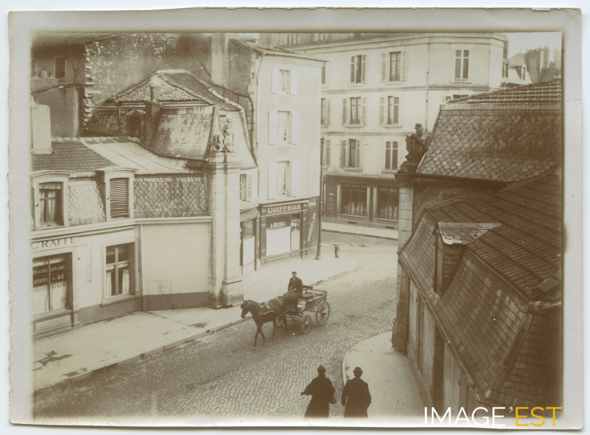 Hémicycle de la Grande Rue près de la porte de la Craffe à Nancy (Meurthe-et-Moselle) le 3 mars 1906. Une mention manuscrite au verso de cette photographie précise : " J.Z. N° 633 - 3 mars 1906 - L'hémicycle de la grande rue - Vue prise du haut du rempart - 5 ".
