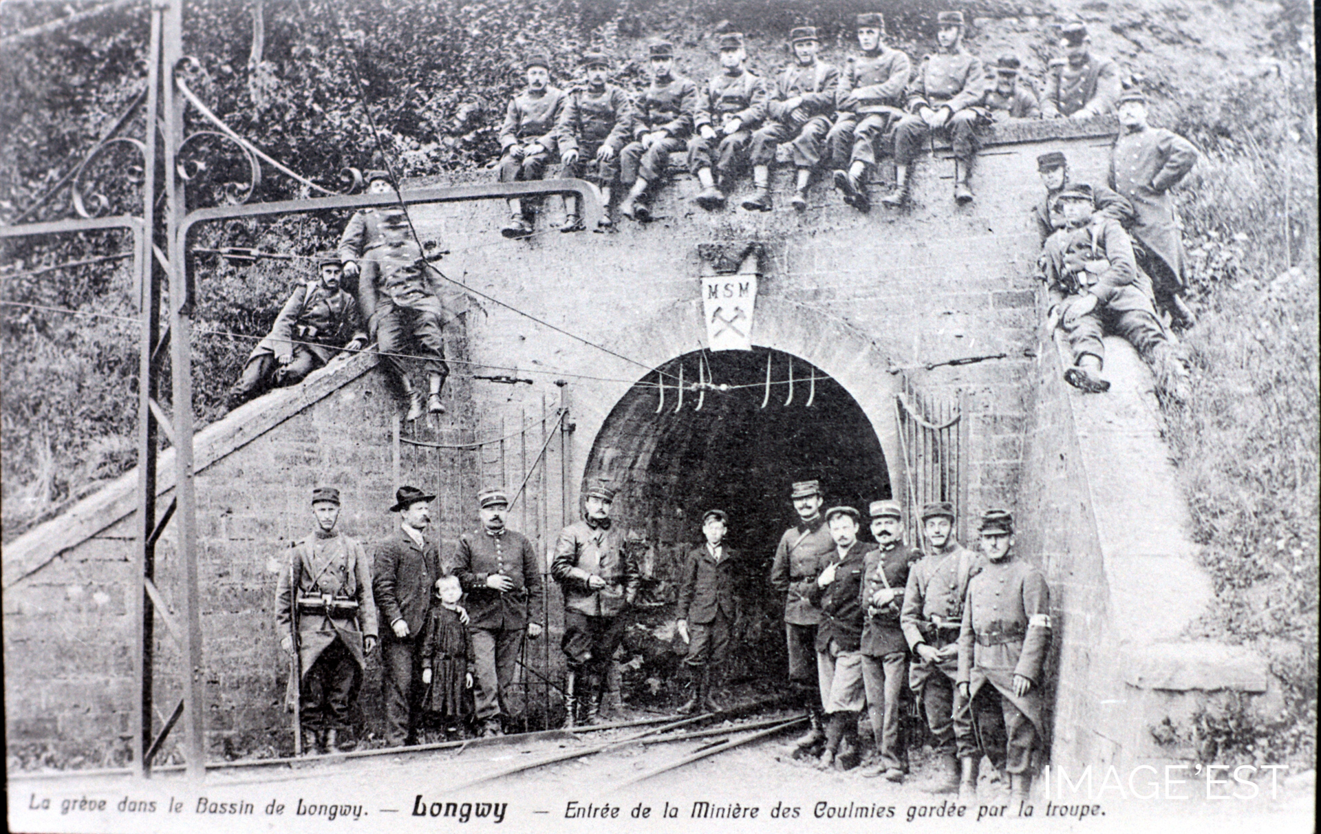 Entrée de la Minière des Coulmies à Longwy (Meurthe-et-Moselle), gardée par une troupe de soldats lors des grèves du bassin minier de Longwy en 1905.