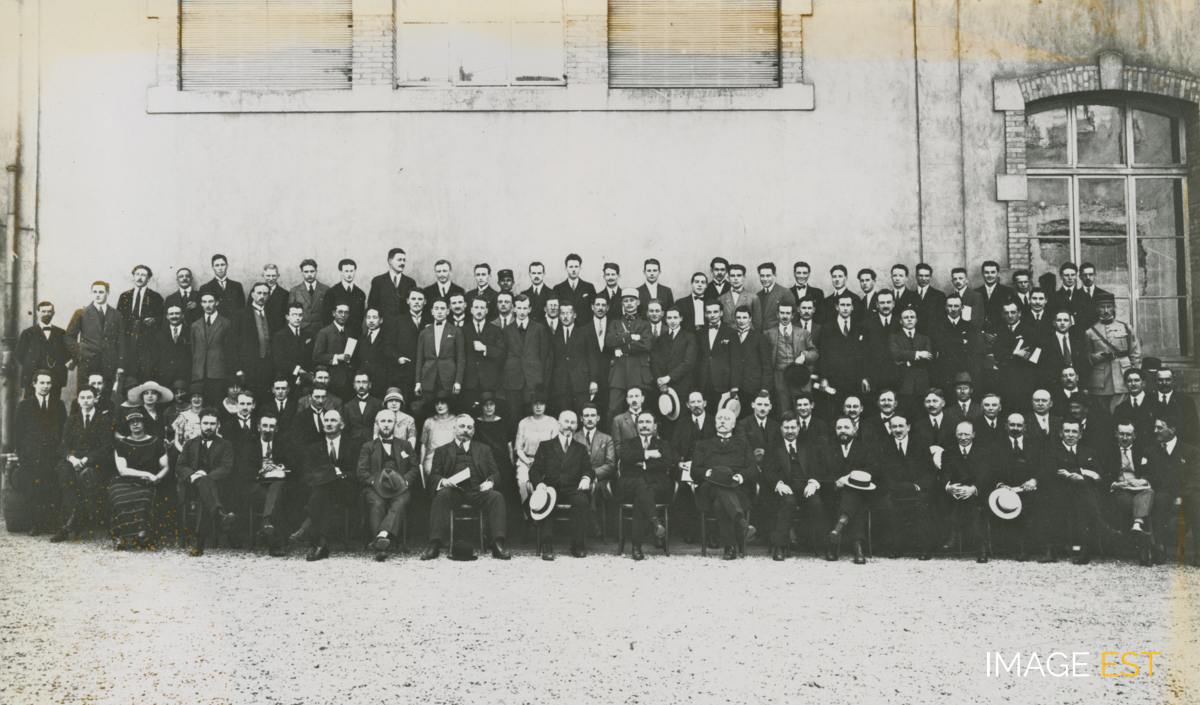 Groupe d'enseignants, d'étudiants et d'étudiantes de l'Institut chimique de Nancy (Meurthe-et-Moselle) en 1925 photographiés devant le bâtiment de la rue Sellier. Sur une feuille dactylographiée qui accompagne cette photographie figurent les noms de queslques personnes : " Dans le fond : Jacob, Malaprade, Bouain; Bureau, Kolb, etc. Au milieu : Hinzelin, Poquelin, Garnier, Tchen Yi, Leroy, etc. Au deuxième rang : Songis, Honnelaitre, Mademoiselle Toussaint, etc. Au premier rang : Mademoiselle Mathis, Benoît, Guntz (fils), Millery, Vavon, Guntz (directeur ICN), Bourion, Travers, Chaye, Tresson, Kronberg, etc. ".