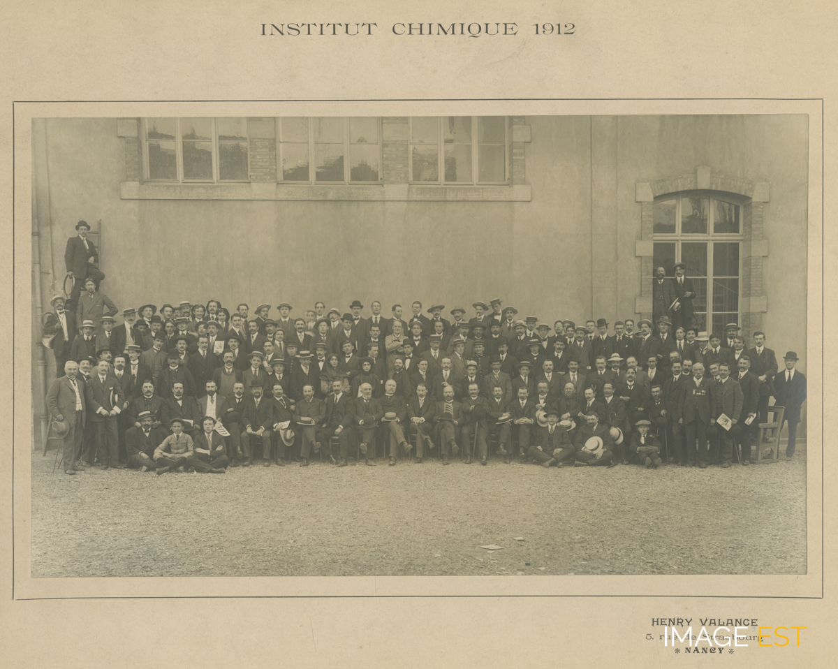 Groupe d'enseignants et d'étudiants dans la cour de l'Institut chimique de Nancy (Meurthe-et-Moselle) en 1912. Mention du photographe professionnel Henry Valance, installé 5, rue de Strasbourg à Nancy.
