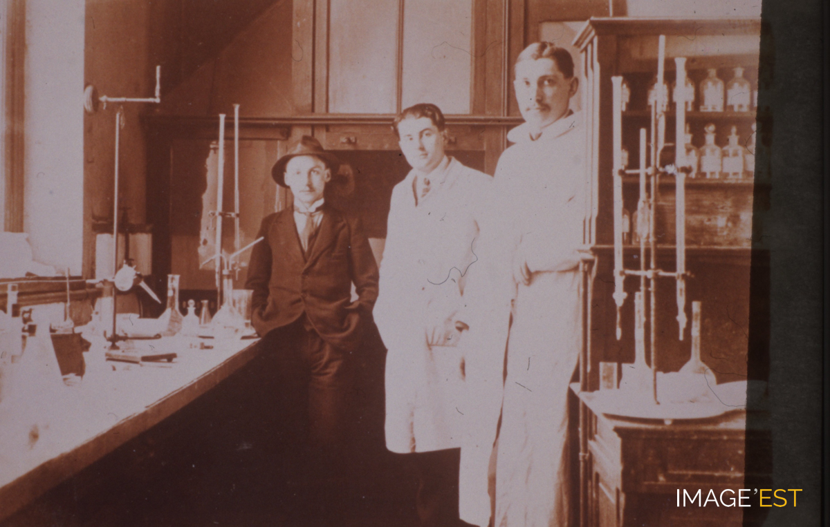 Groupe d'étudiants dans un laboratoire de l'Institut chimique de Nancy (Meurthe-et-Moselle). Une mention manuscrite précise : " 1924. Godin, Parisot, Cery (?) ".
