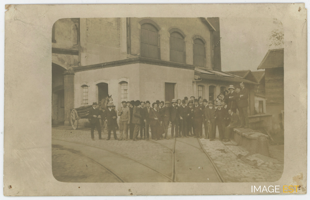 Groupe d'hommes dans la cour des Brasseries à Maxéville (Meurthe-et-Moselle). Au verso, l'annotation manuscrite : " Promenade à la Brasserie de Maxéville : 14 mai 1908 ".