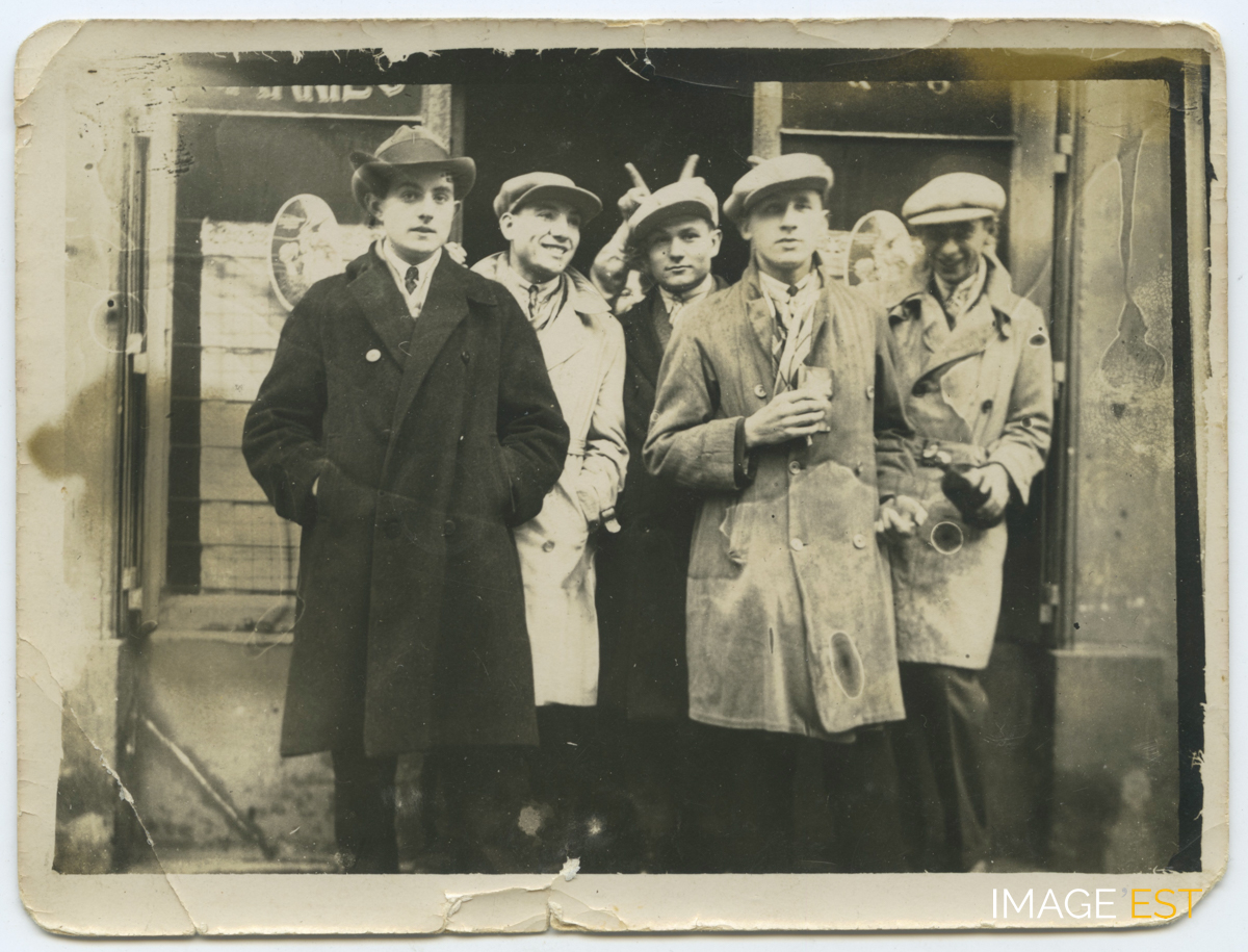Groupe de maxévillois devant un café à Maxéville (Meurthe-et-Moselle). Au verso, une annotation précise : " le 11 novembre 1928 " suivi d'une signature.