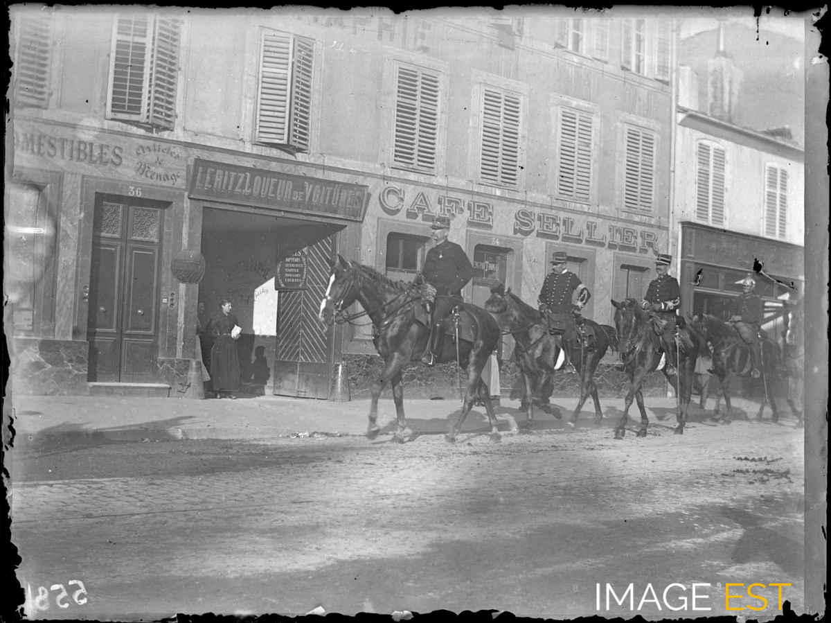 Groupe de cavaliers probablement avenue de Strasbourg à Nancy (Meurthe-et-Moselle). À remarquer la publicité murale sous le porche d'entrée, l'enseigne du photographe " Photographie Dufey ". Il s'agit d'un photographe professionnel, Henry Dufey (1853-1929) qui était installé au 36, avenue de Strasbourg entre 1891 et 1907, puis au 9 rue de la Constitution de 1907 à 1924.