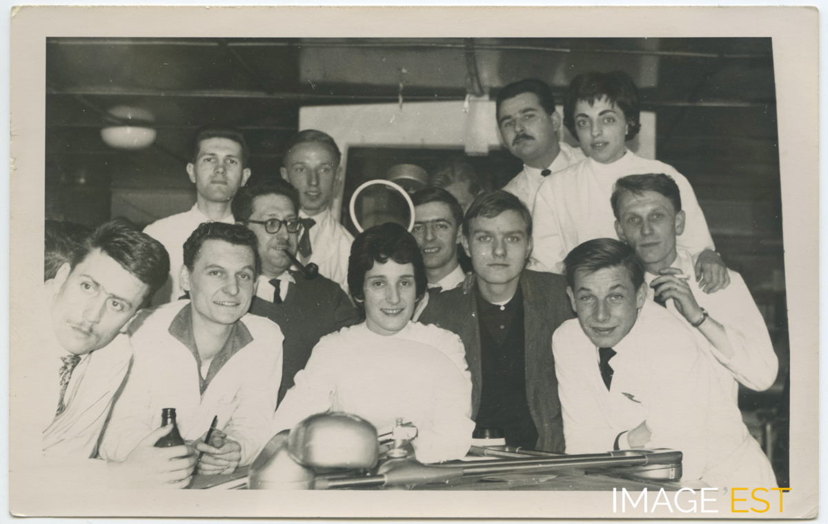 Groupe de dessinateurs du Bureau d'études de Jean Prouvé à proximité des ateliers Jean Prouvé à Maxéville (Meurthe-et-Moselle).