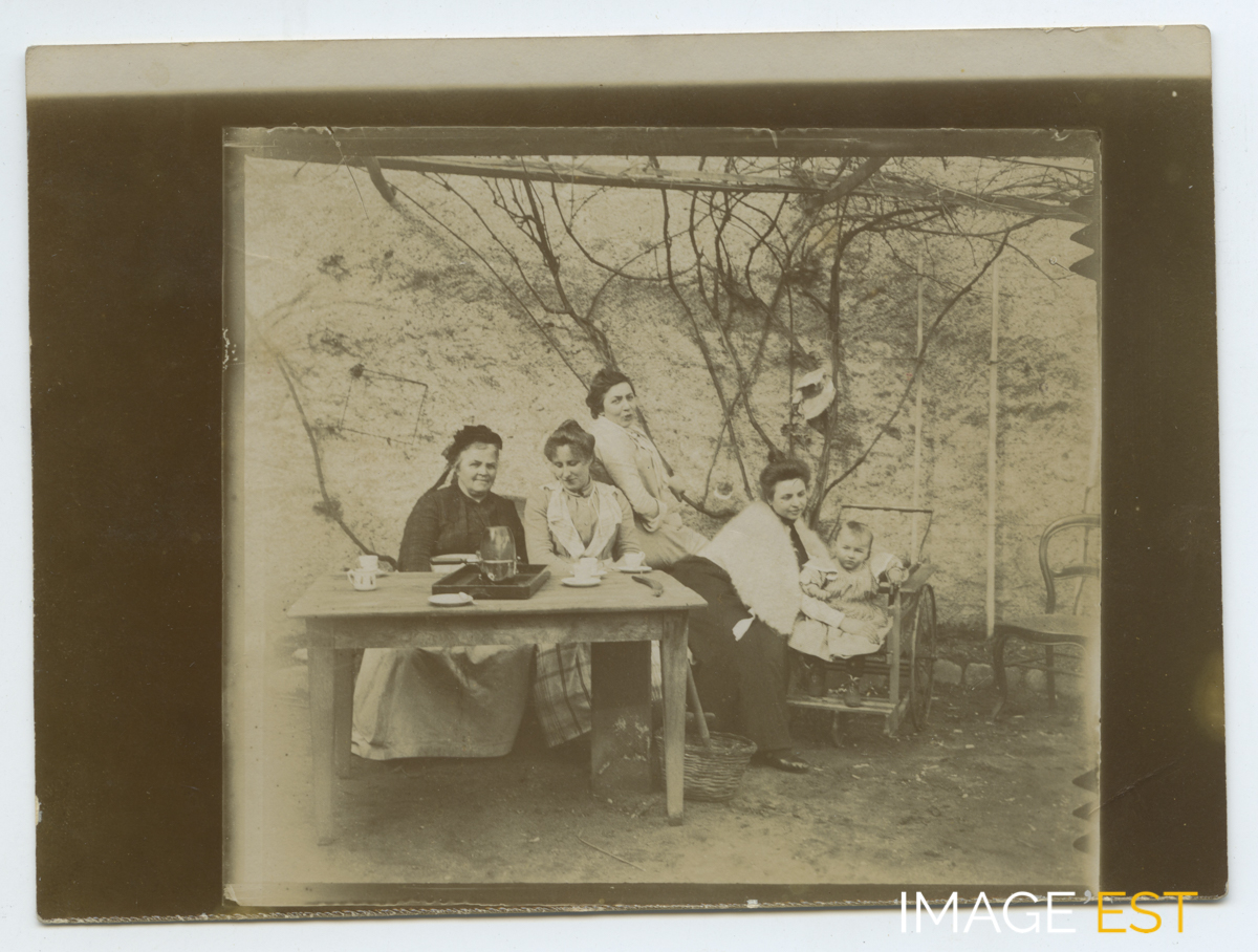 Groupe de femmes attablées probablement dans le département des Vosges. Cette photographie est extraite d'un album en cuir repoussé comprenant un ensemble de 48 photographies (format 13 x 18 cm), noir et blanc, illustrant les loisirs et la vie d'une famille aisée probablement dans le département des Vosges à la fin du XIXe ou au début du XXe siècle.
