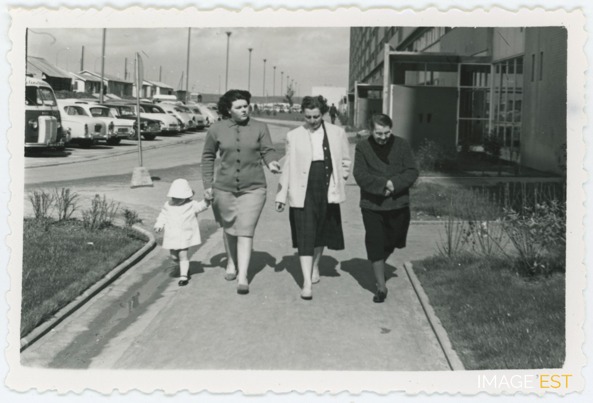 Groupe de femmes marchant devant un bâtiment du Haut-du-Lièvre au plateau de Haye à Nancy (Meurthe-et-Moselle).