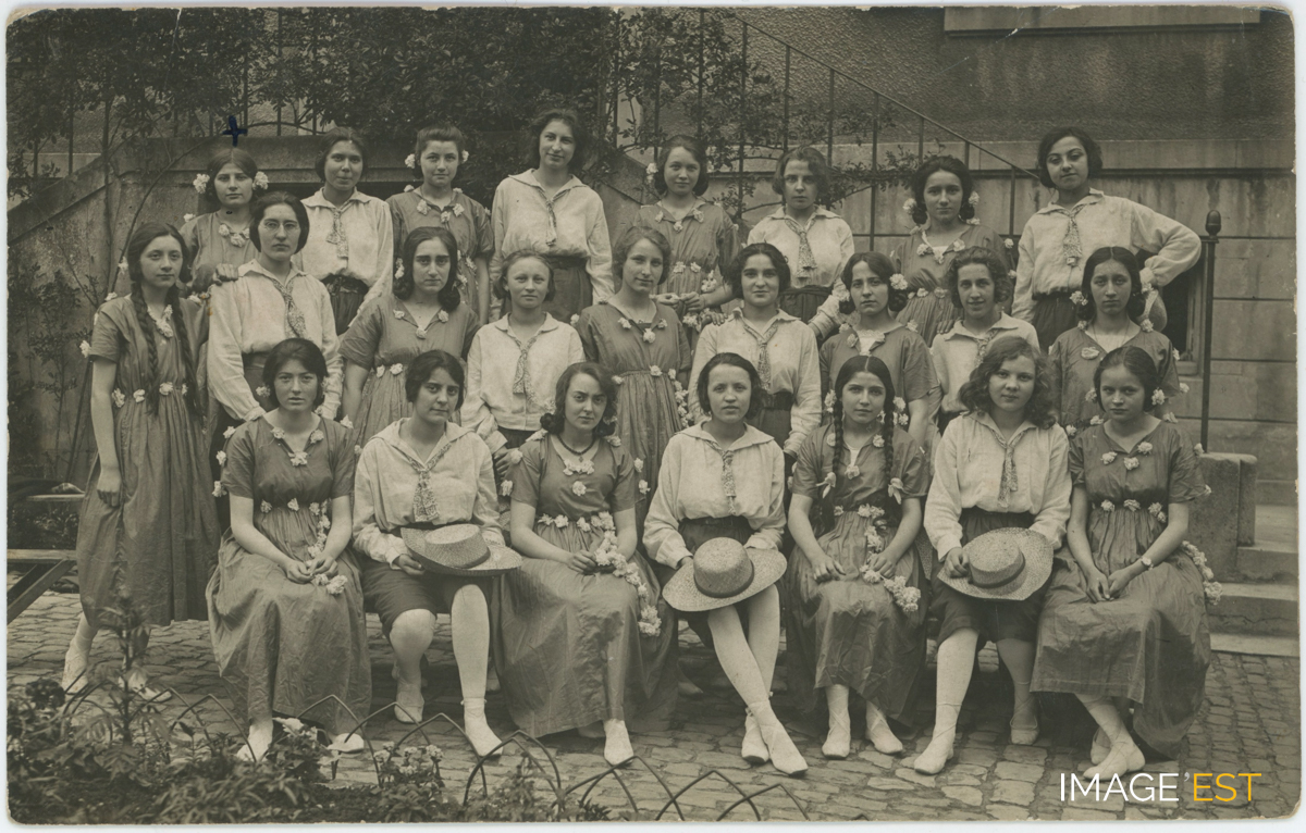 Groupe de jeunes filles costumées à l'issue d'une représentation théâtrale à l'École normale de filles À Maxéville (Meurthe-et-Moselle). Au verso, une annotation : " 1920 E.P.S. - dans le rôle d'une " moissonneuse " dans les " Belles Vacances ".