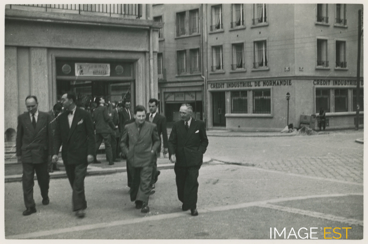 Groupe de personnes non identifiées. Il pourrait s'agir d'enseignants de l'Ensaia (École nationale supérieure d'agronomie et des industries alimentaires) en déplacement probablement en Normandie.