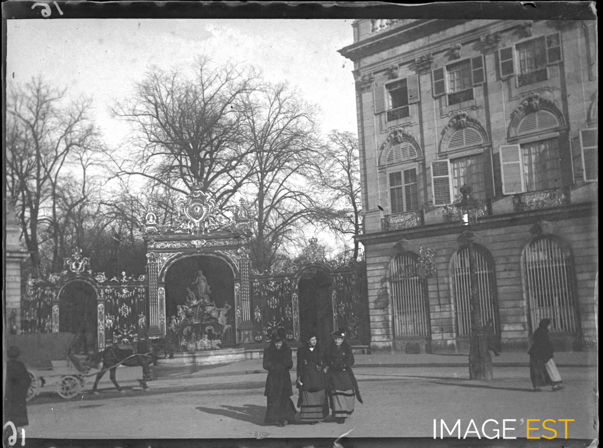 Groupe de trois femmes photographié probablement le 3 décembre 1893 place Stanislas à Nancy (Meurthe-et-Moselle). Sur la boîte originale dont est extraite cette plaque de verre, figure la mention manuscrite : " 15. Mlles Leclaire, Jacquemin et Lallemand - 3 XII 93 ".