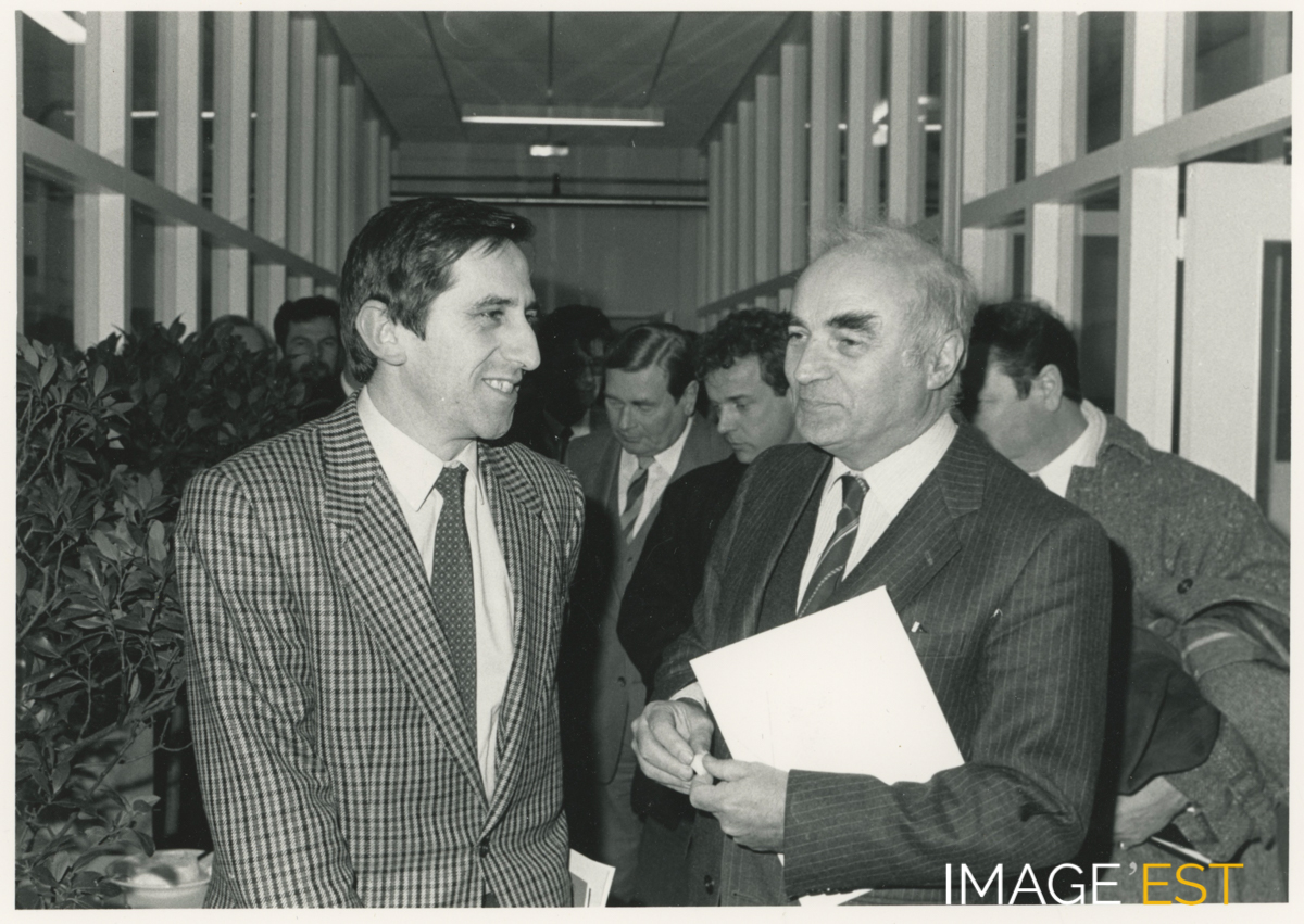 Groupe de personnes (non identifiées) dans un couloir de l'Ensaia (École nationale supérieure d'agronomie et des industries alimentaires) rue Sainte-Catherine à Nancy (Meurthe-et-Moselle). L'histoire de cette institution remonte à la création successive de trois grandes écoles, l'École de brasserie et de malterie de Nancy (1893), l'Institut colonial et agricole de Nancy (1901) et l'École de laiterie de Nancy (1905). En 1948, l'Institut colonial et agricole de Nancy devient l'École nationale supérieure d'agronomie de Nancy (ENSA). En 1971, les trois grandes écoles (École de brasserie, École de laiterie et Ensa) fusionnent et donnent naissance à l'Ensaia. C'est en 1984 que l'Ensaia quitte ses locaux de la rue Sainte-Catherine à Nancy pour s'installer sur le plateau de Brabois (Source : https://ensaia.univ-lorraine.fr/fr/content/histoire-ensaia).
