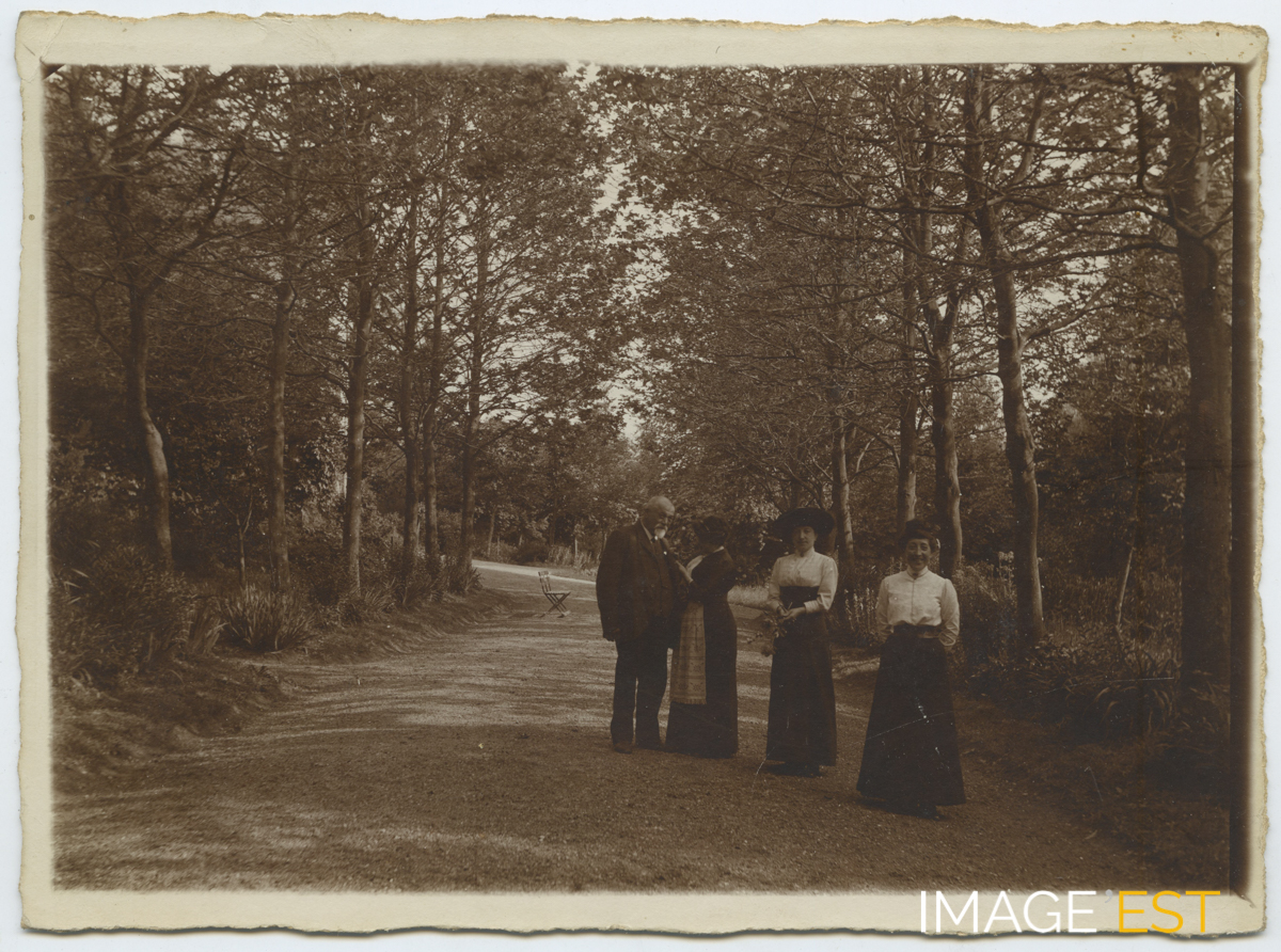 Groupe de promeneurs sur une allée boisée probablement dans le département des Vosges. Cette photographie est extraite d'un album en cuir repoussé comprenant un ensemble de 48 photographies (format 13 x 18 cm), noir et blanc, illustrant les loisirs et la vie d'une famille aisée probablement dans le département des Vosges à la fin du XIXe ou au début du XXe siècle.