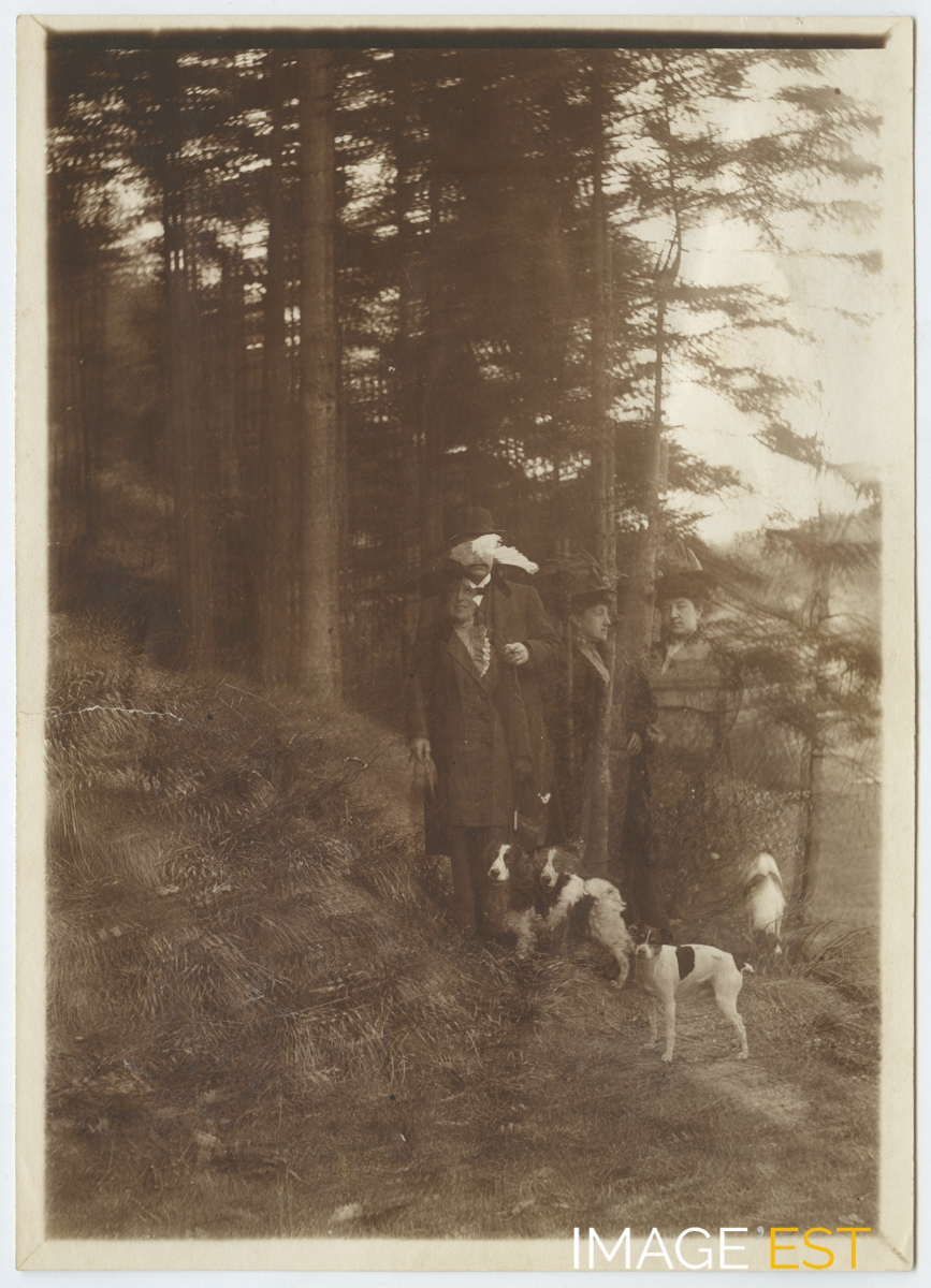Groupe de promeneurs en forêt probablement dans le département des Vosges. Cette photographie est extraite d'un album en cuir repoussé comprenant un ensemble de 48 photographies (format 13 x 18 cm), noir et blanc, illustrant les loisirs et la vie d'une famille aisée probablement dans le département des Vosges à la fin du XIXe ou au début du XXe siècle.