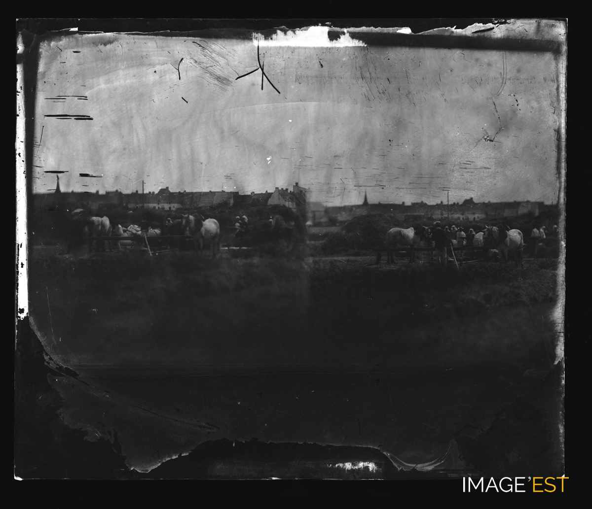 Groupe de travailleurs dans un champ probablement à Saillé (Loire-Atlantique), photographié à quelques instants d'intervalle. Deux vues ont été superposées sur la même plaque, laissant apparaître une jonction imparfaite. Les deux vues présentent plusieurs hommes travaillant la terre, tandis que des chevaux, attelés, semblent tirer une charrue au premier plan. À l'arrière-plan, se dessine un village, dominé par le clocher d'une église. Photographie sur plaque de verre au collodion attribuée au peintre Eugène Feyen (1815-1908), né à Bey-sur-Seille (Meurthe), probablement réalisée à des fins d'études en vue de la réalisation des oeuvres Les Paludières (vers 1872) et La récolte du sel à Saillé (vers 1875). (Sources : https://www.bro-gwenrann.org/les-costumes / https://www.leguerandais.fr/fr/paludiers/outils-paludier / Christian Debize, Photographes et photographies d'art à Nancy au 19 siècle : Exposition, Nancy, Musée des beaux-arts, 17 juin-5 septembre 1983, p.50-55)