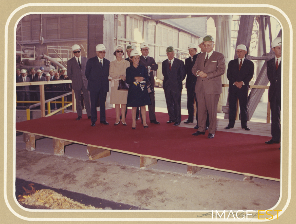 Visite officielle à l'usine de la " Société des hauts-fourneaux et fonderies de Pont-à-Mousson " à Pont-à-Mousson (Meurthe et Moselle). Le nom du photographe est noté au crayon en bas à droit : Ray Delvert (1914-1992). Au verso, le cachet " Photo Ray Delvert " - 47- Villeneuve-s-Lot - tél.600 Cliché n° E - 5 ".