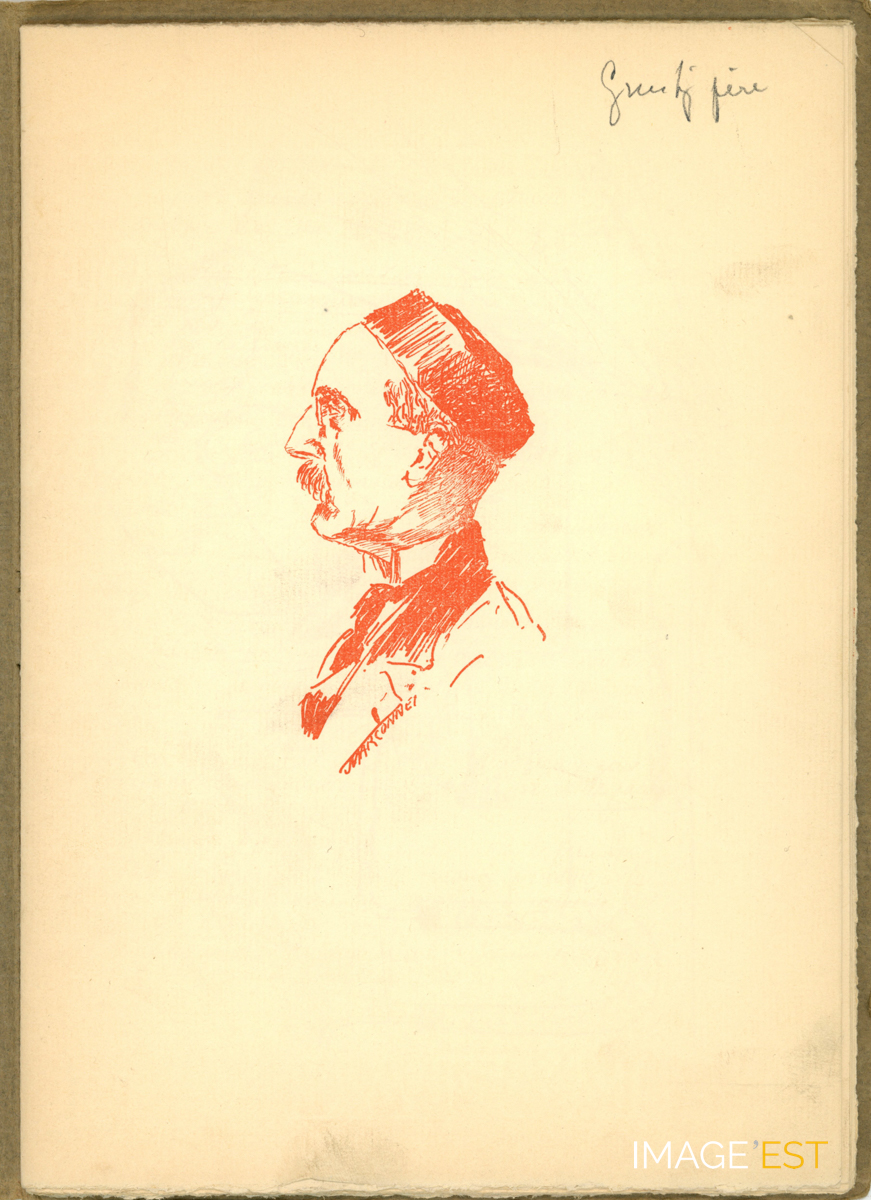 Page extraite d'une brochure intitulée " Guyotinés en Rouge-Turc " comprenant une série de dessins illustrant des professeurs de l'Institut chimique de Nancy. Ce dessin est signé Marconnet.