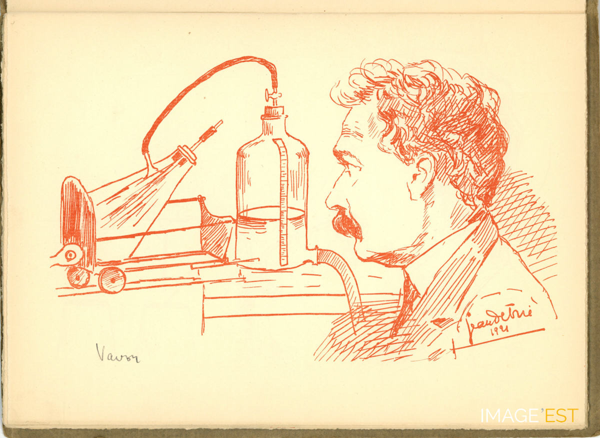 Page extraite d'une brochure intitulée " Guyotinés en Rouge-Turc " comprenant une série de dessins illustrant des professeurs de l'Institut chimique de Nancy. Ce dessin est signé Jean Detrie 1921.