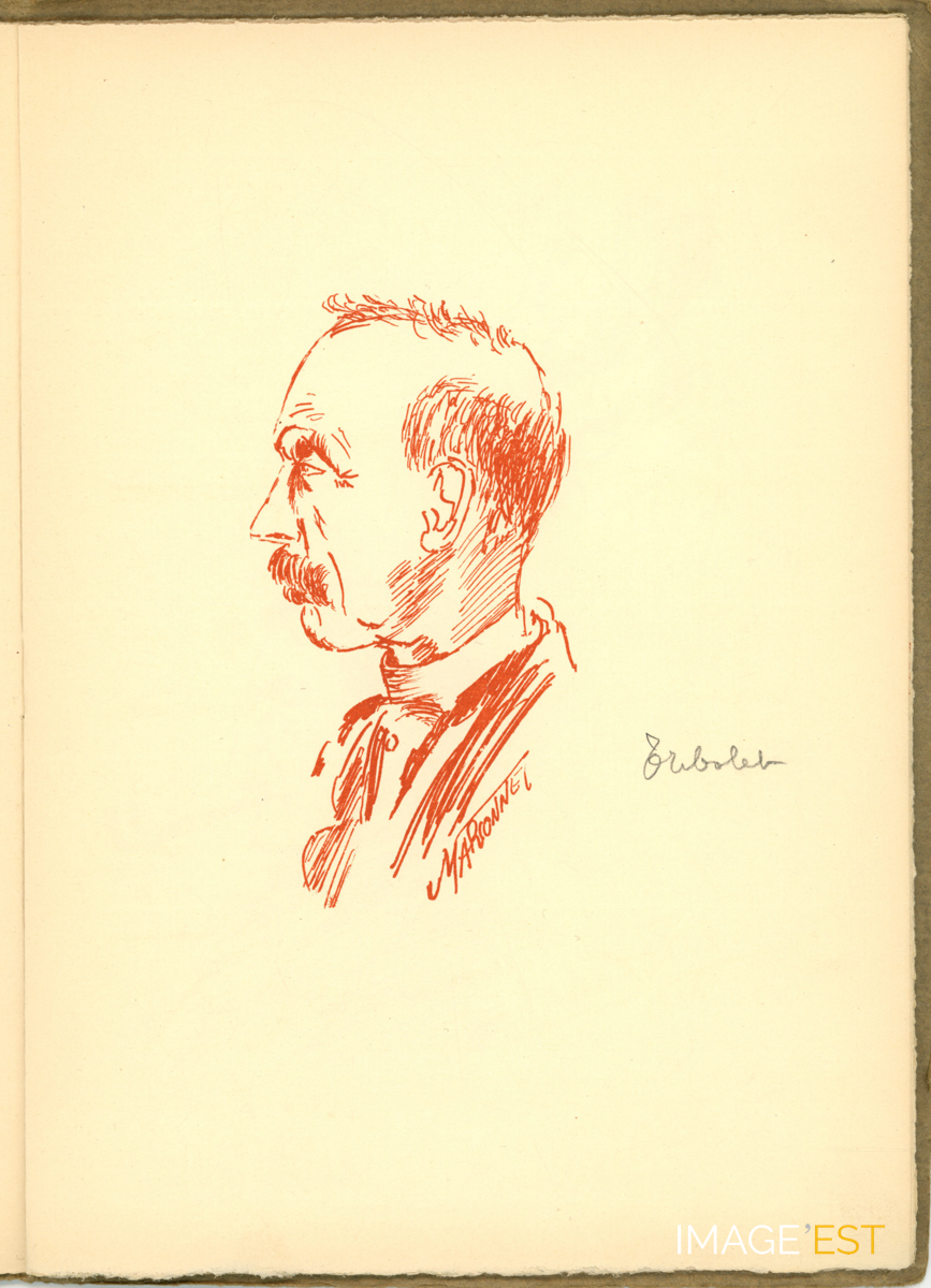 Page extraite d'une brochure intitulée " Guyotinés en Rouge-Turc " comprenant une série de dessins illustrant des professeurs de l'Institut chimique de Nancy. Ce dessin est signé Marconnet.