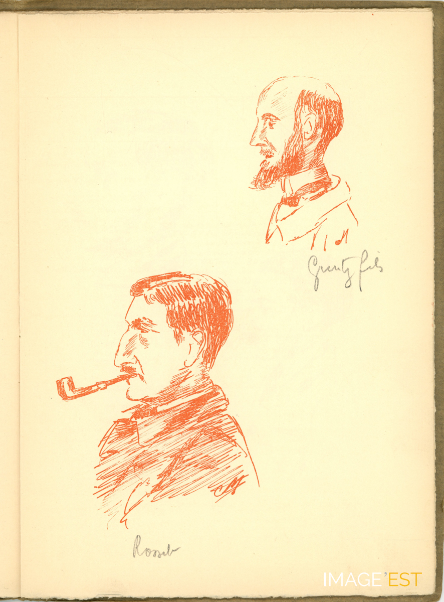 Page extraite d'une brochure intitulée " Guyotinés en Rouge-Turc " comprenant une série de dessins illustrant des professeurs de l'Institut chimique de Nancy. Les deux dessin sont signés M.