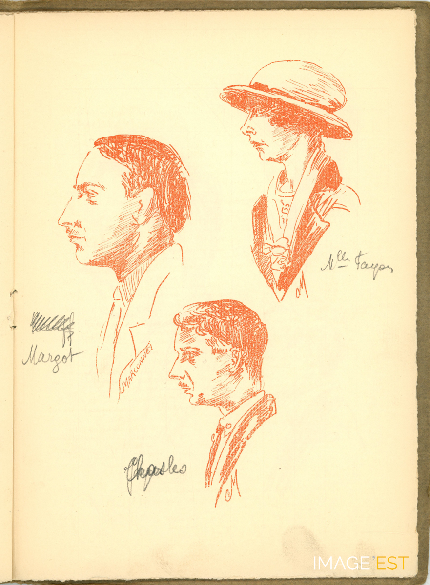 Page extraite d'une brochure intitulée " Guyotinés en Rouge-Turc " comprenant une série de dessins illustrant des professeurs de l'Institut chimique de Nancy. Les trois dessins sont signés M et Marconnet.