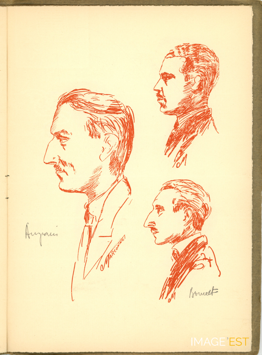Page extraite d'une brochure intitulée " Guyotinés en Rouge-Turc " comprenant une série de dessins illustrant des professeurs de l'Institut chimique de Nancy. Les trois dessins sont signés M et Marconnet.