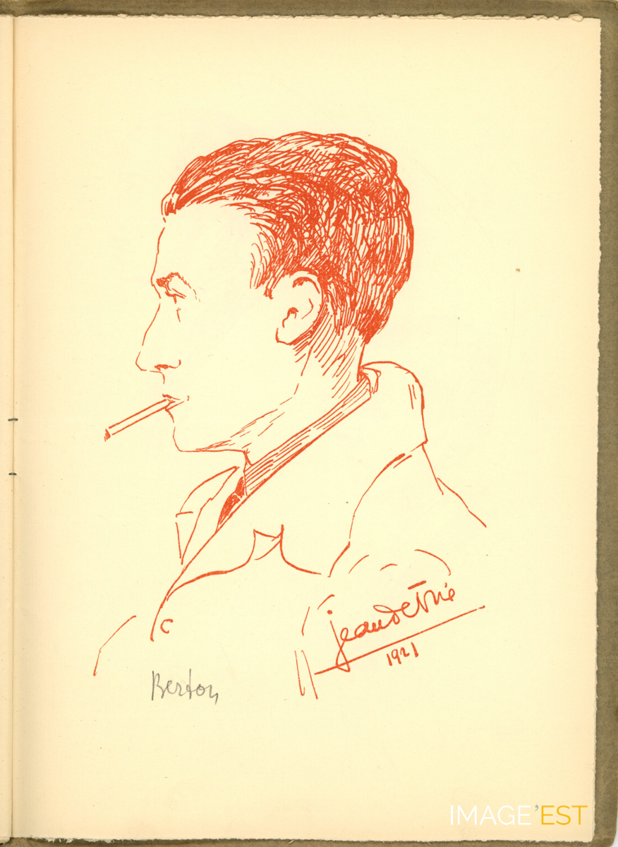 Page extraite d'une brochure intitulée " Guyotinés en Rouge-Turc " comprenant une série de dessins illustrant des professeurs de l'Institut chimique de Nancy. Le dessin est signé " Jean Detrie 1921 ".